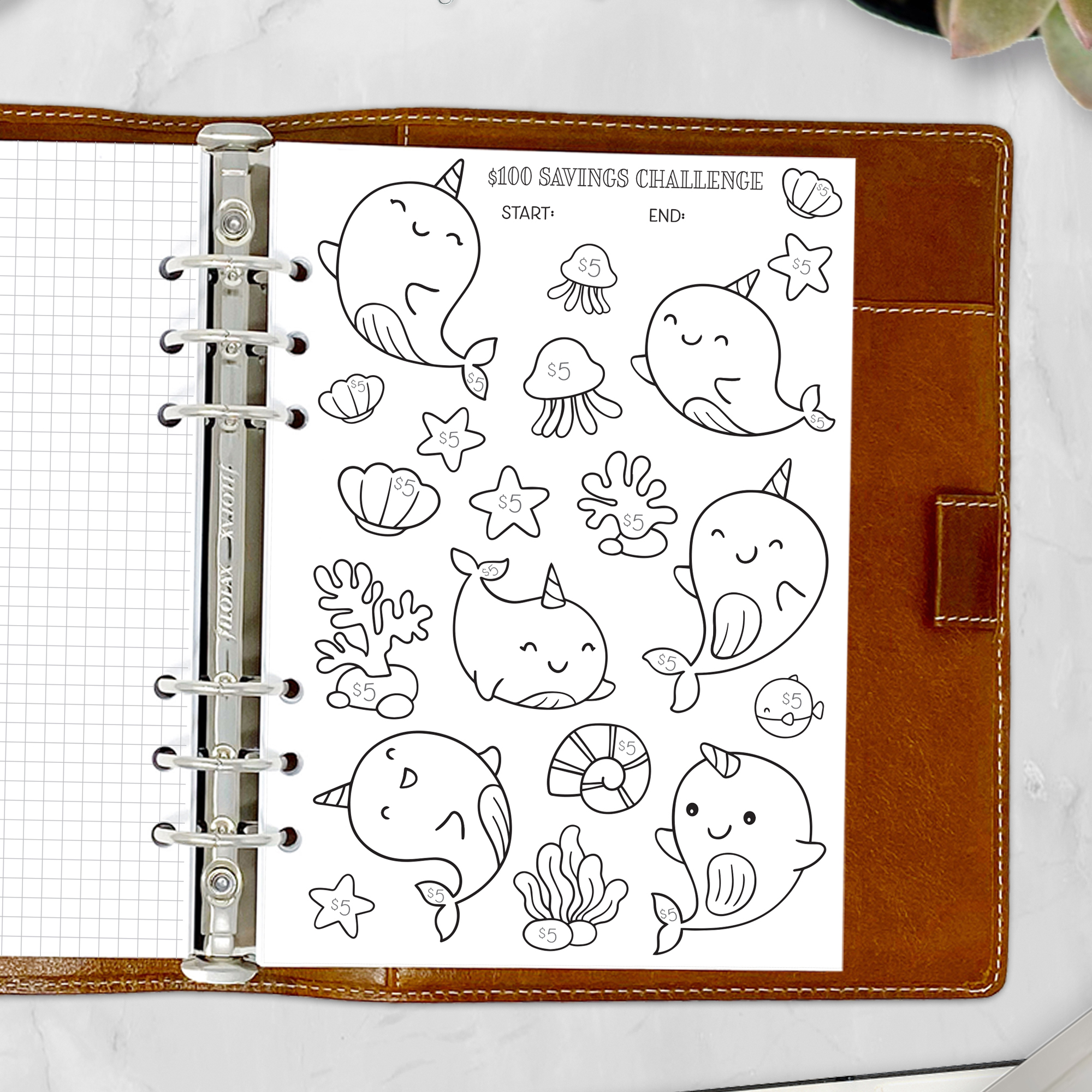 $100 Savings Challenge Planner Insert – Narwhal Design, Track $5 Increments