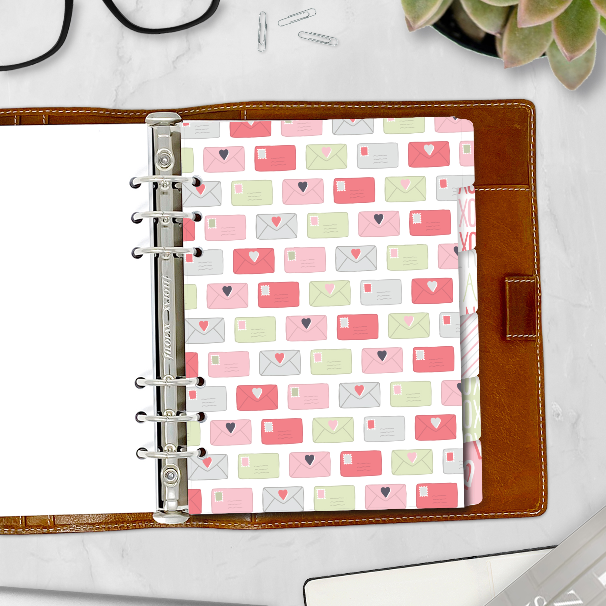Bring a touch of affection to your planner with our “Love Mail” tabbed dividers. Featuring beautiful graphics of love letters, XOXO, and hearts in subtle, soft colors, these dividers add a serene and lovely vibe to your organization. Perfect for those who love a blend of elegance and Valentine-inspired charm.