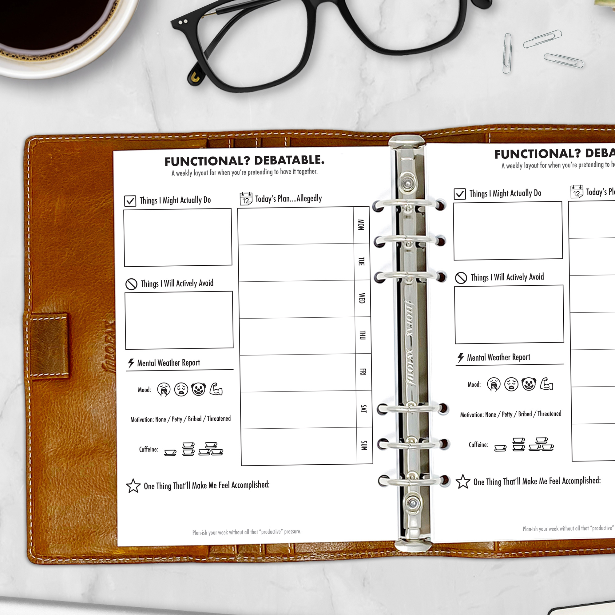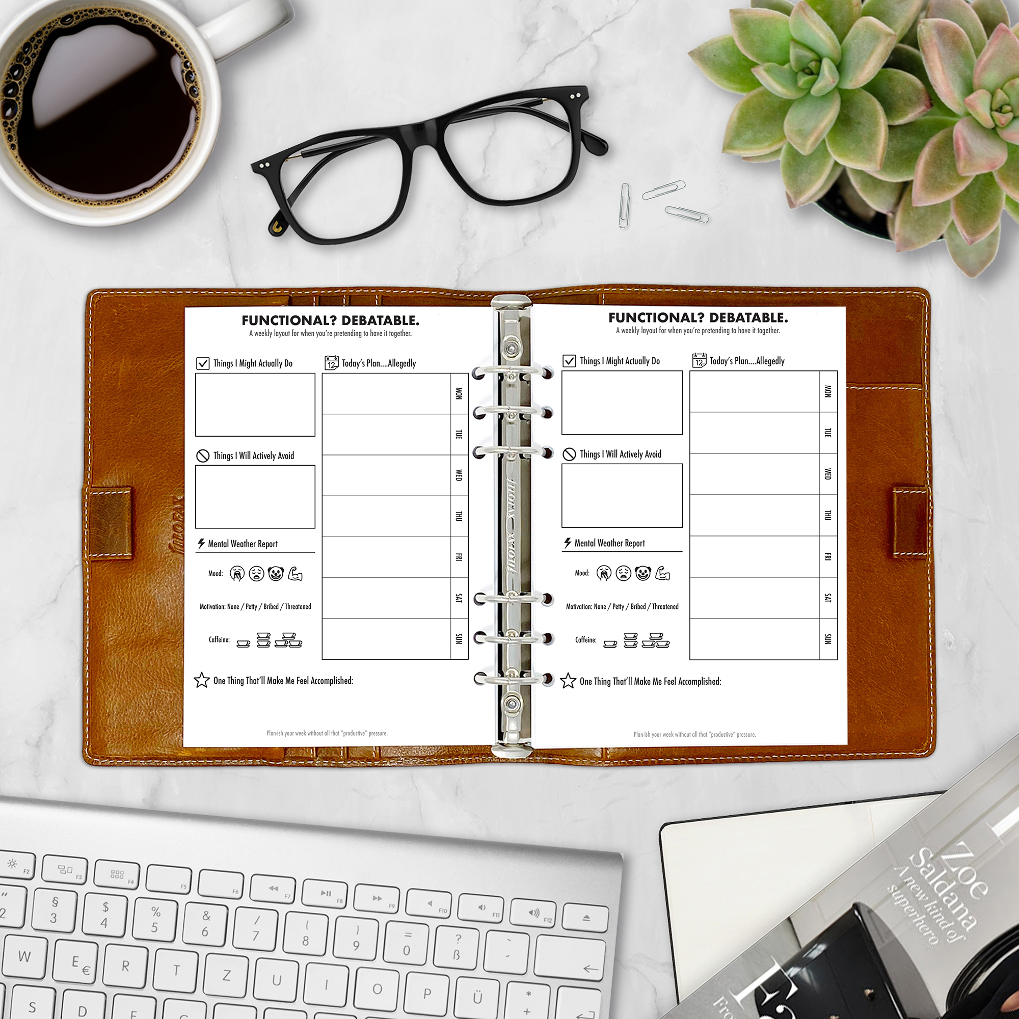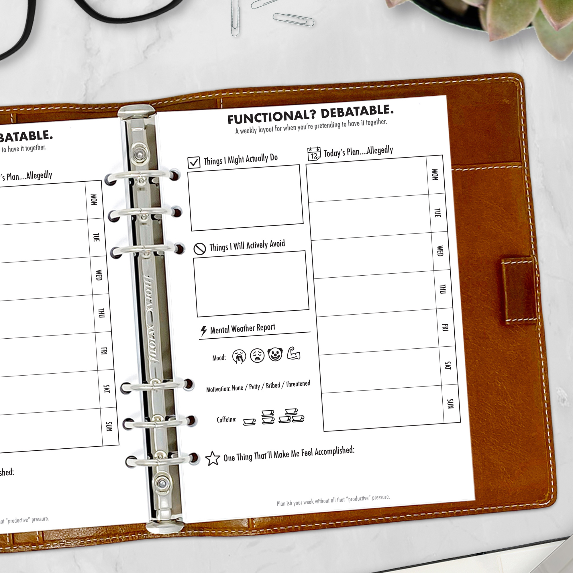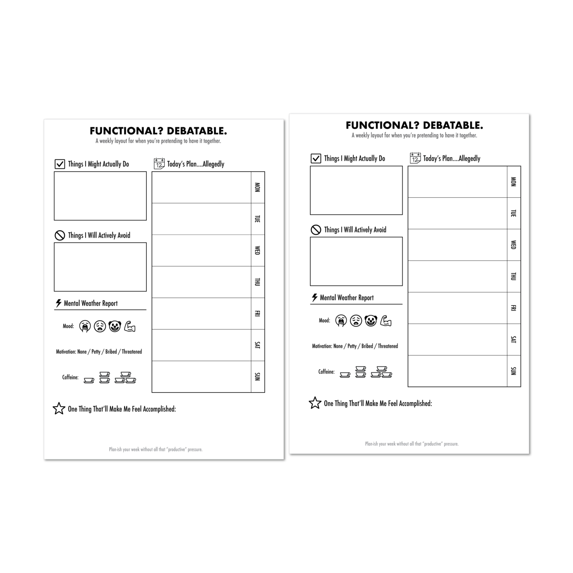The Functional? Debatable. Planner Insert is your perfect sidekick for days when you’re kind of trying… but also not really. With just enough structure to keep you from falling off the rails—and just enough snark to make you laugh—it’s ideal for half-hearted productivity, glorified procrastination, and glorious chaos.
