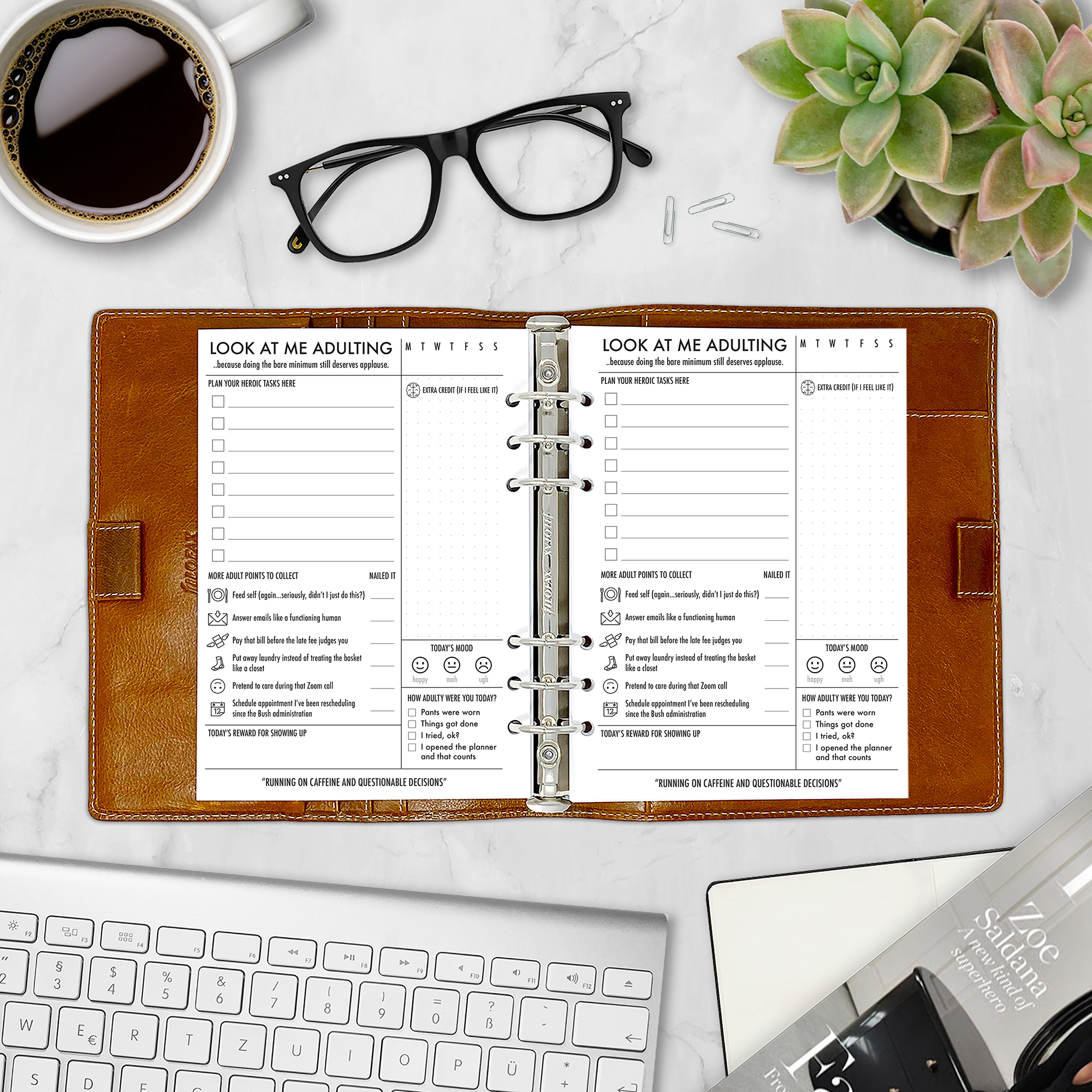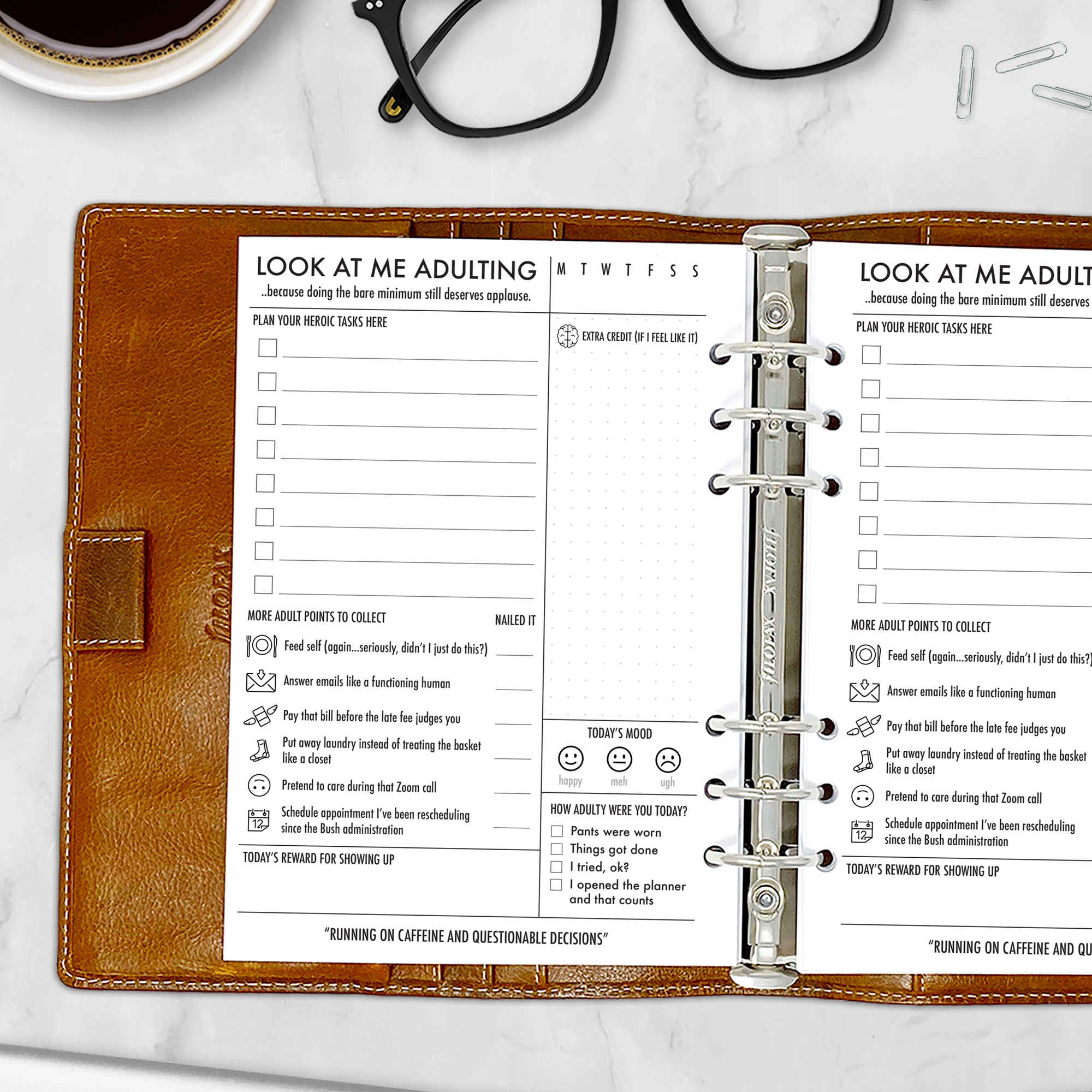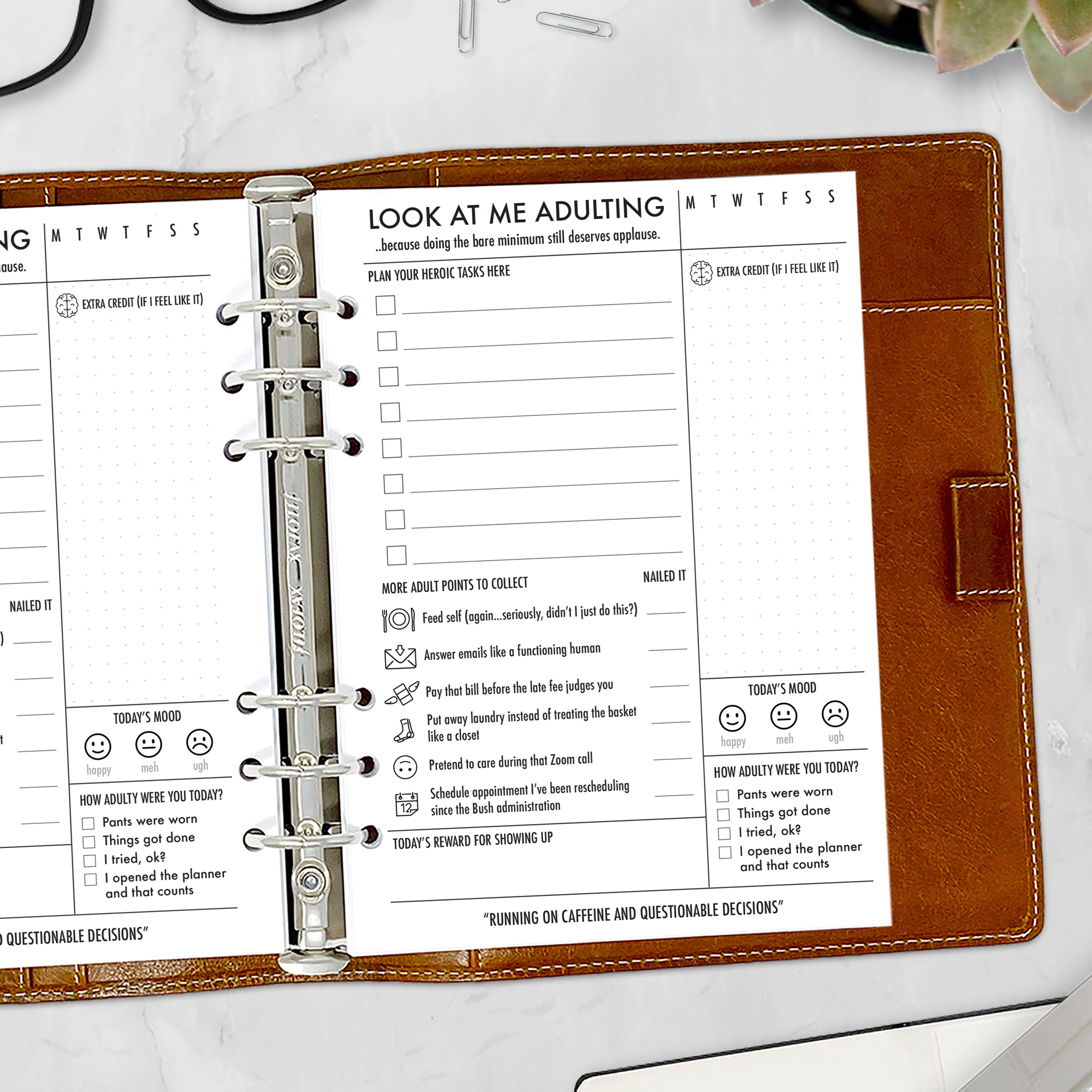 The Look At Me Adulting insert is for those days when brushing your teeth and feeding the cat deserves a standing ovation. This cheeky planner page is filled with essential (and hilarious) daily tasks so you can track progress while maintaining your sarcasm.