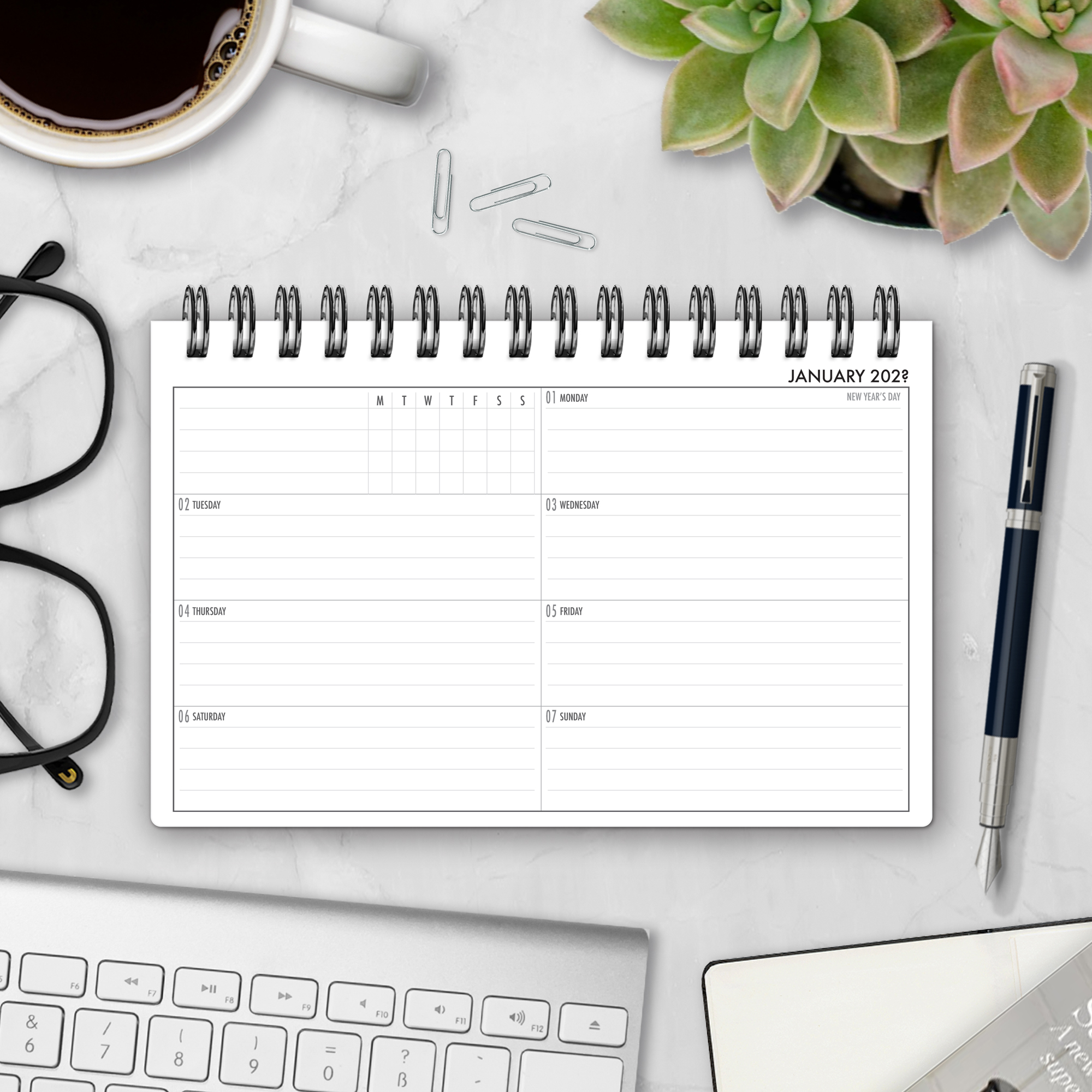 Discover the ultimate organization companion with our Half-Size Spiral Planner! This beautifully crafted 5.5 x 8.5-inch planner is perfect for those who love to plan efficiently without sacrificing style. With a sturdy horizontal top-bound twin loop wire, it’s designed to lay flat for easy writing. Choose your full year from the drop-down in standard or academic.