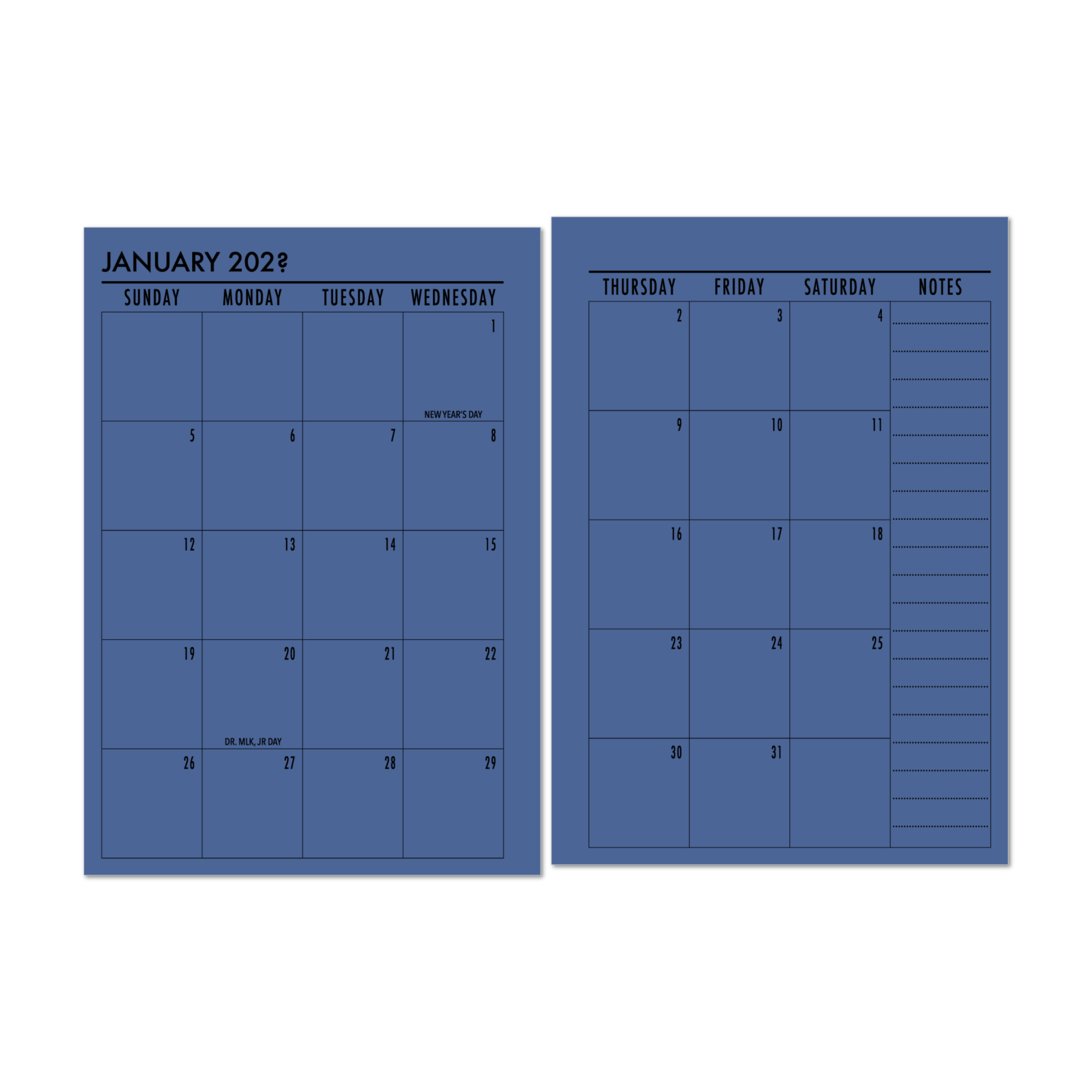 - CALENDAR LAYOUT – Choose from Deluxe or Compact. The Deluxe features our “This Month” dashboard before each month, where you can record your approach for the month. On the backside of the monthly, you have a Notes page to write the information you need to keep handy. It is great if you like to separate each month with dividers. If you prefer your calendar slimmer or have smaller diameter rings, go with the Compact version. The Compact takes out the dashboard and notes pages, so the months are printed back to back.
