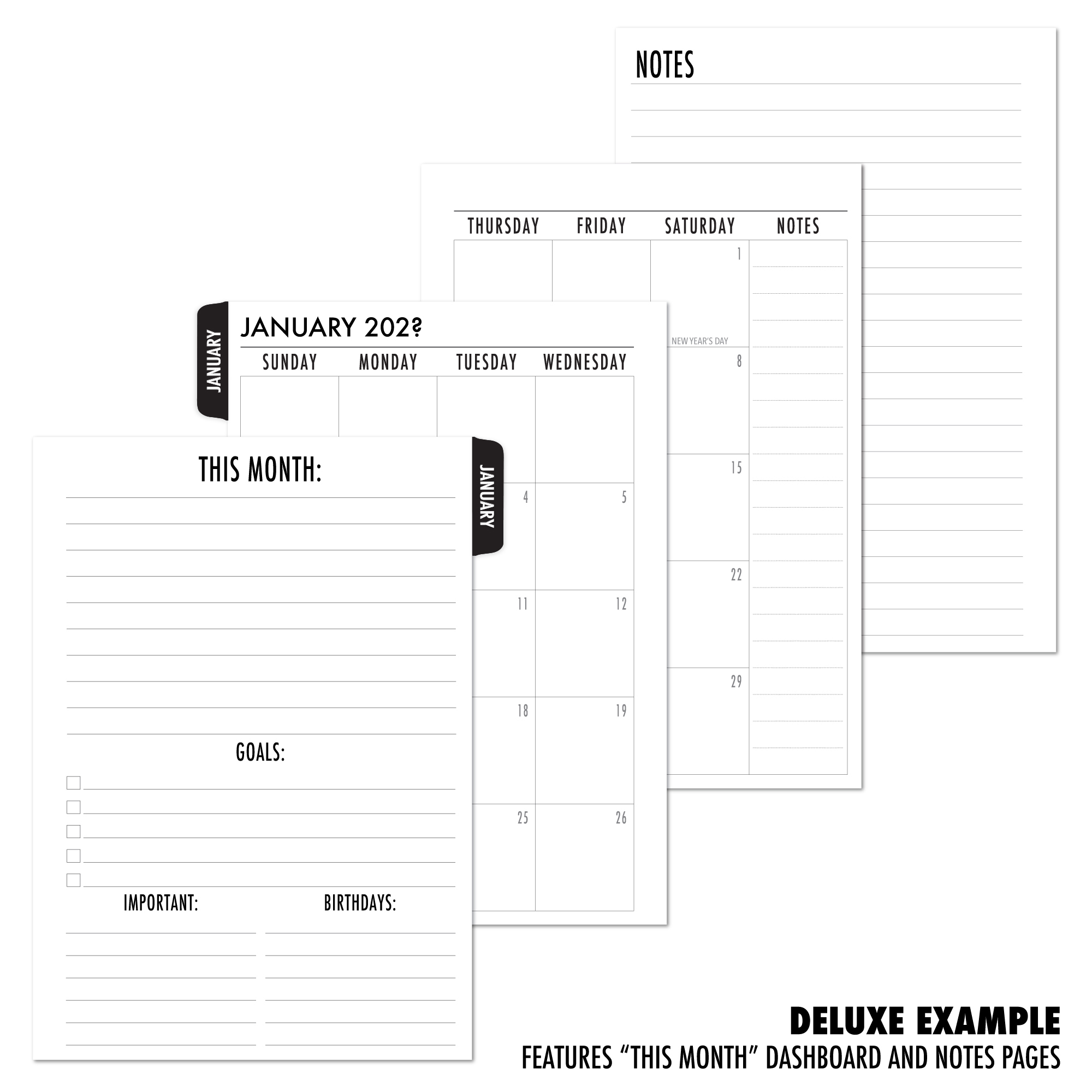 - CALENDAR LAYOUT – The Deluxe features our “This Month” dashboard before each month, where you can record your approach for the month. On the backside of the monthly, you have a Notes page to write the information you need to keep handy. It is great if you like to separate each month with dividers. This calendar is not available in the Compact version due to the tabs. The calendar is a Sunday start only.