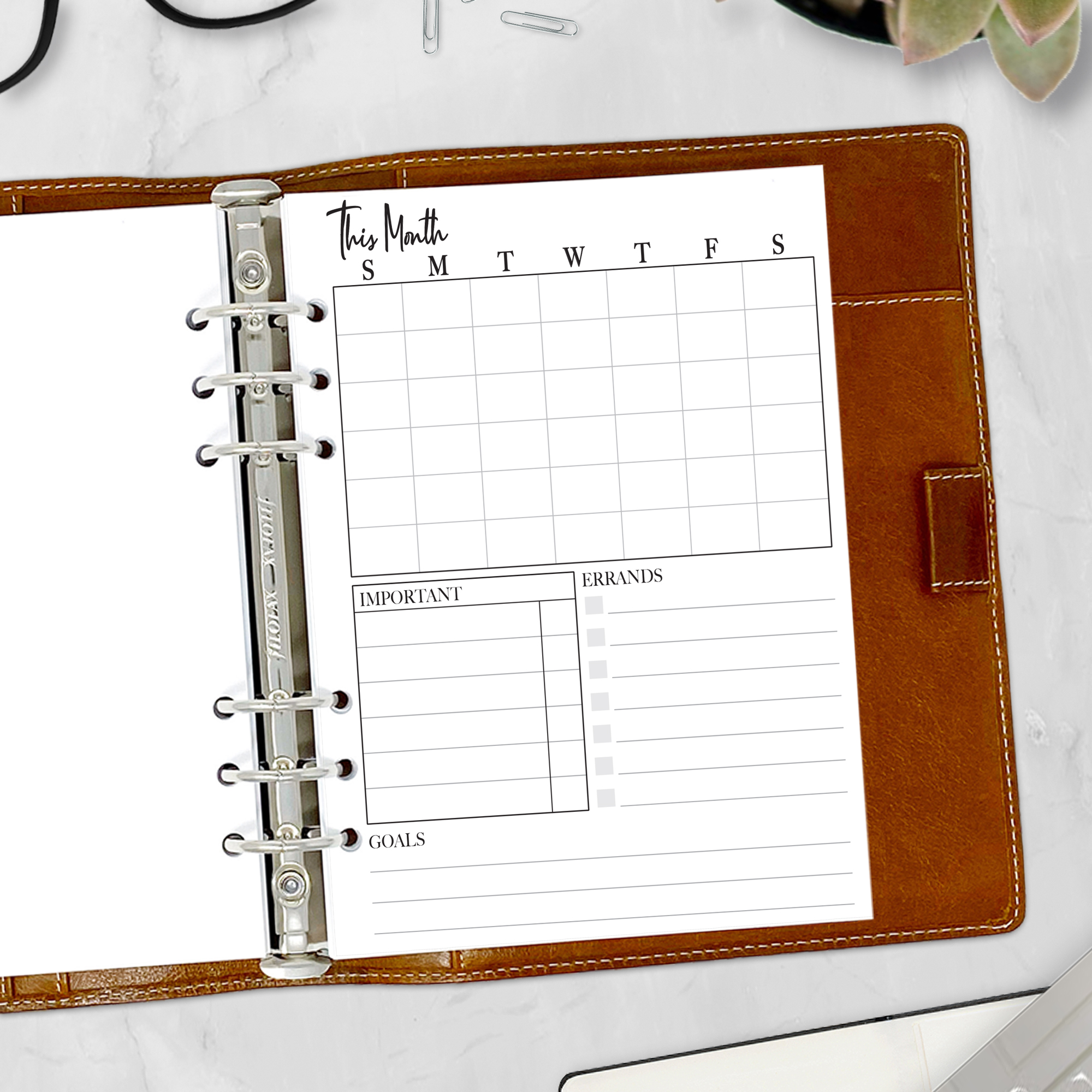 - Undated Monthly Grid: Plan your month with areas for important information, errands, and goals.