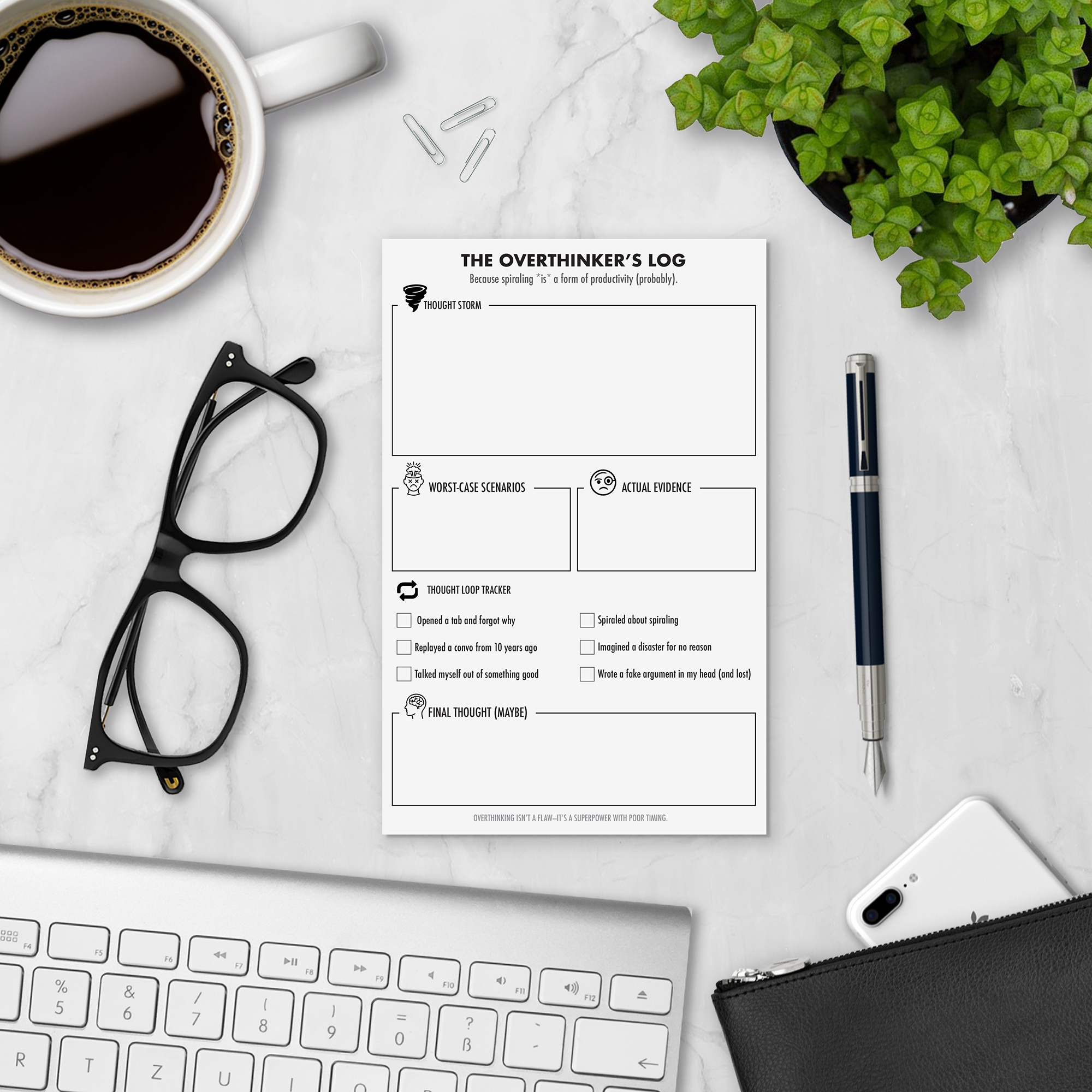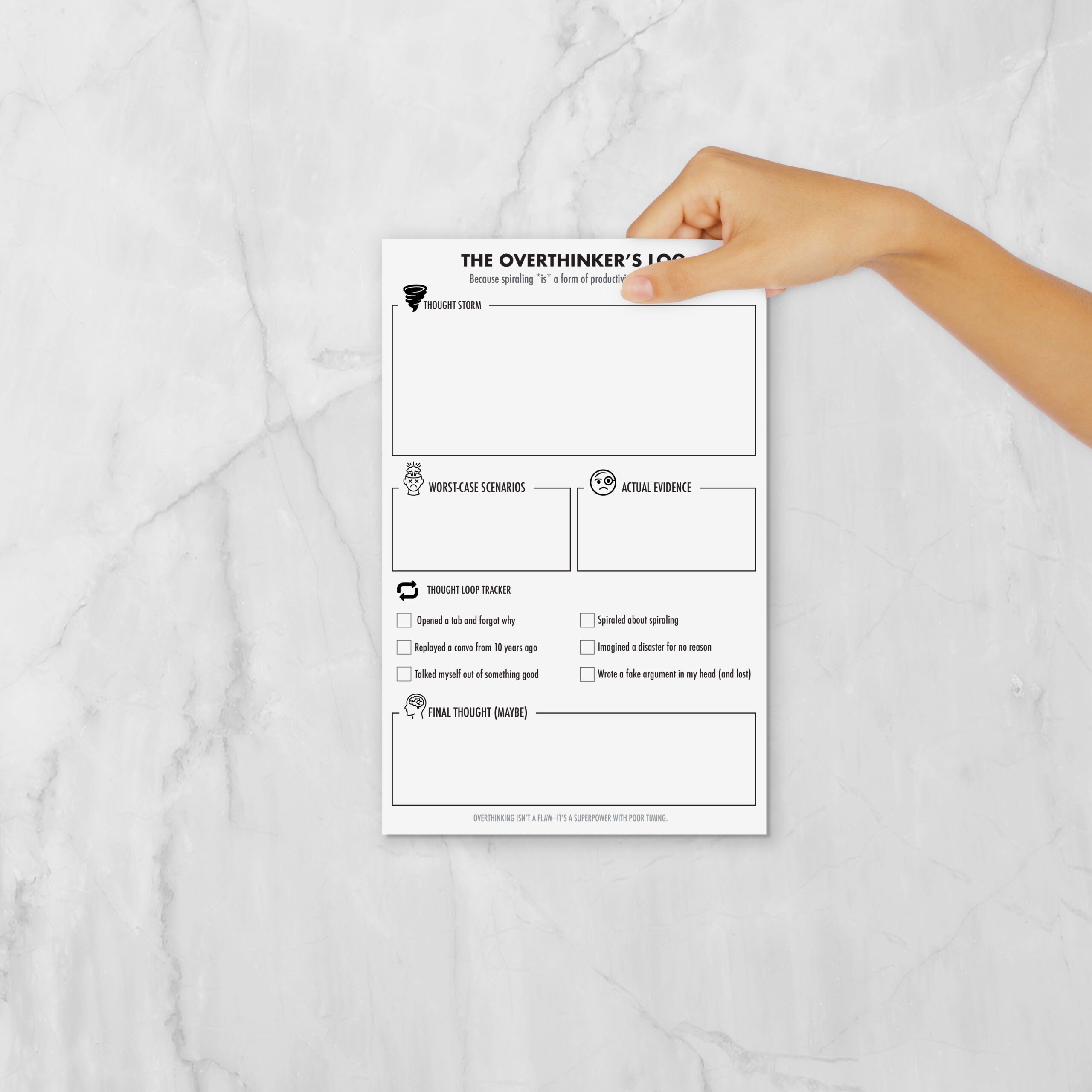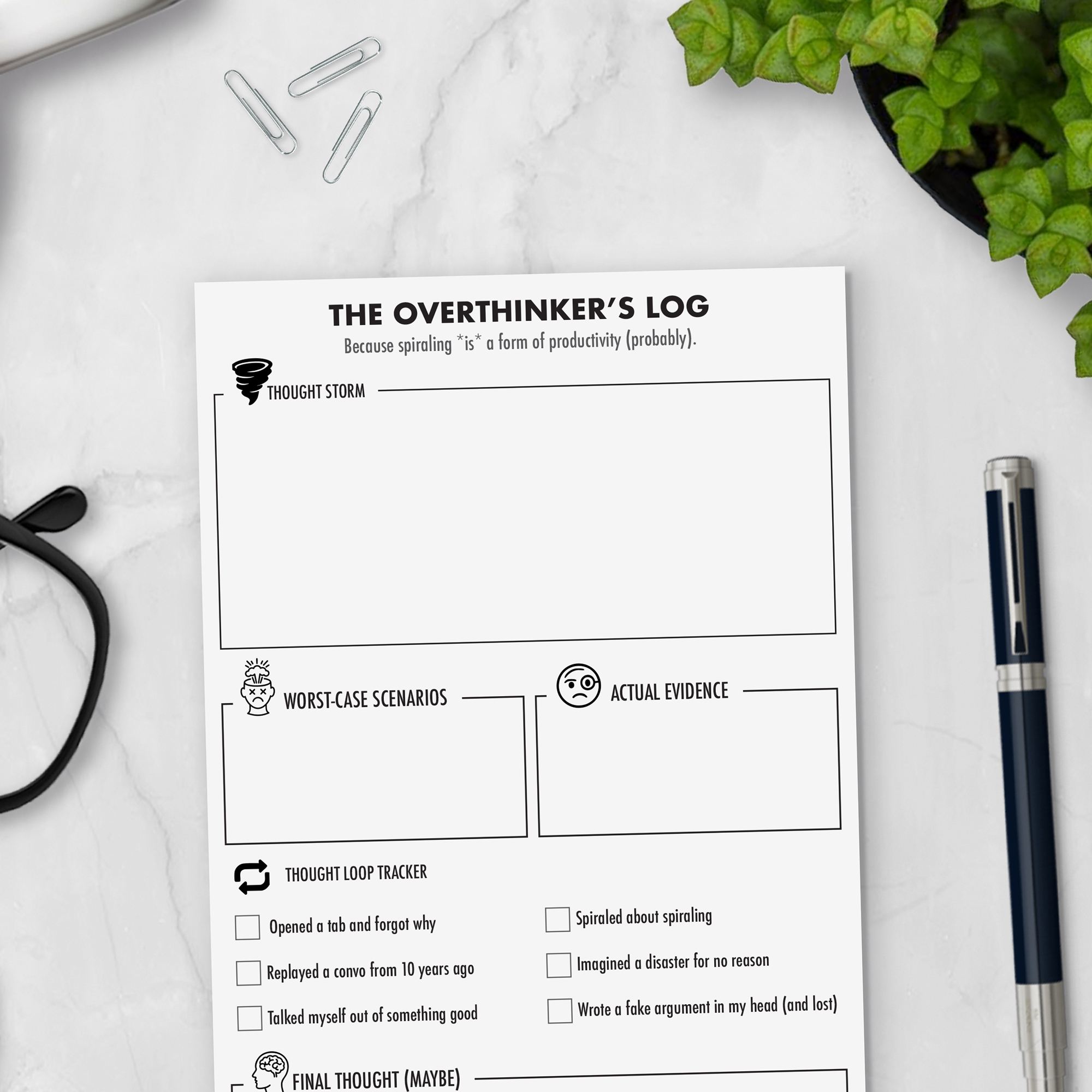 The Overthinker’s Log notepad with a thought storm brain dump, worst-case vs. actual evidence sections, and a thought loop tracker for catching your spirals. A funny, functional gift for the chronic overthinker.