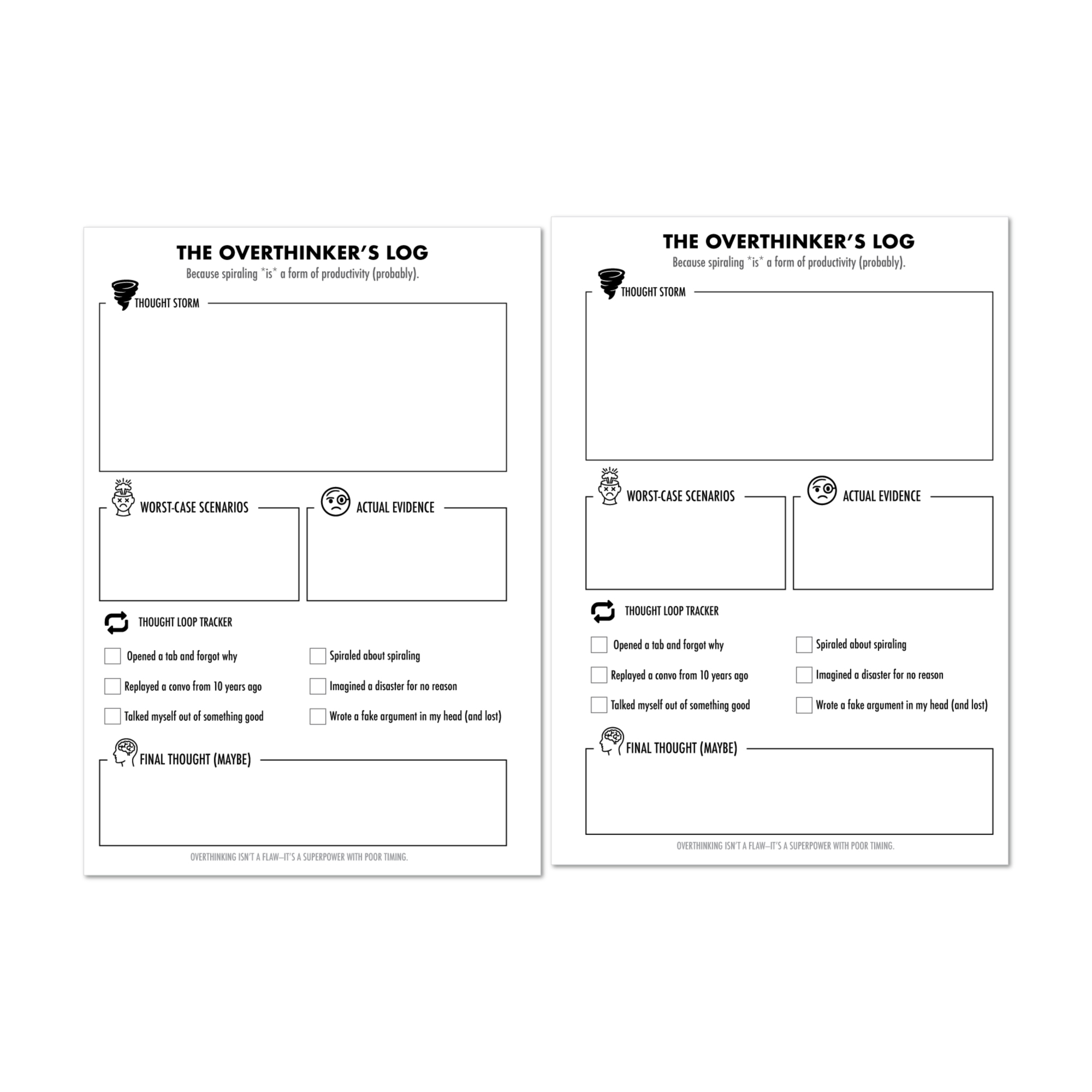 The Overthinker’s Log is designed for those of us who lie awake wondering if that email sounded too aggressive or if Sharon from Accounting is secretly mad. This insert gives your spiraling thoughts a place to live, breathe, and hopefully… calm the heck down.