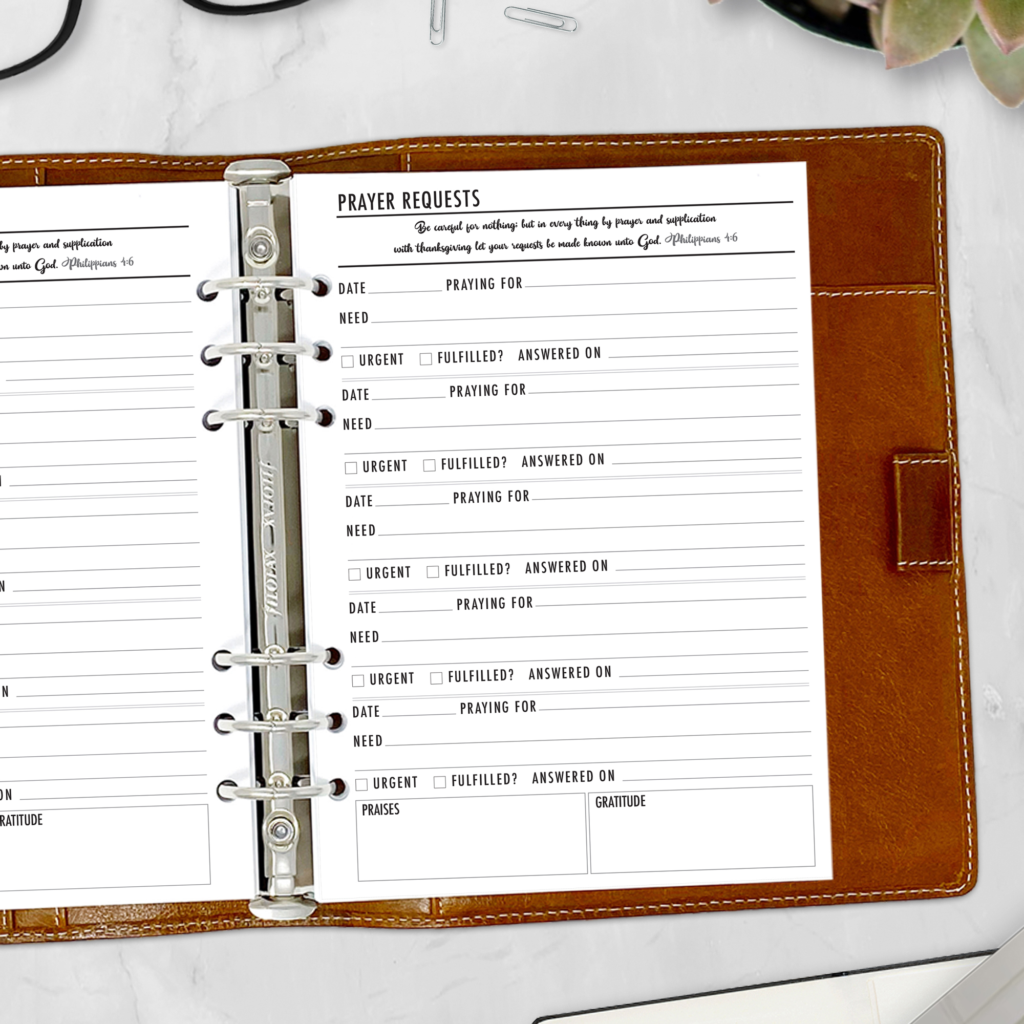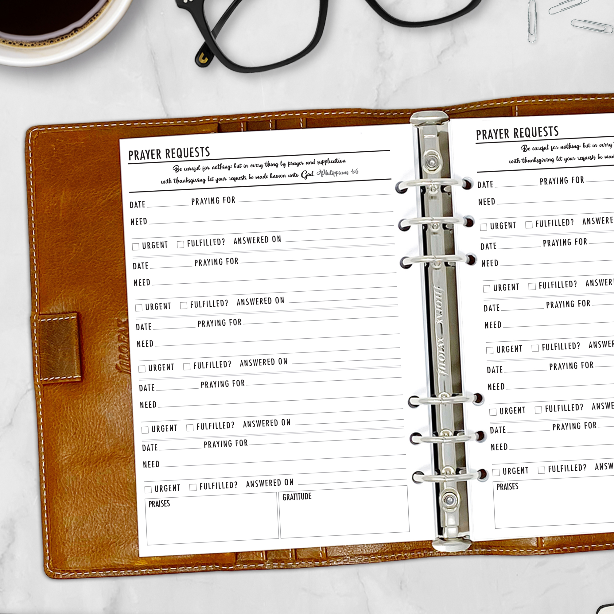 The Prayer Requests planner insert gives you a simple, structured way to write down intentions, answered prayers, or requests from others. Whether you’re journaling your own thoughts or lifting others up, these pages are a calming companion to your spiritual journey.
