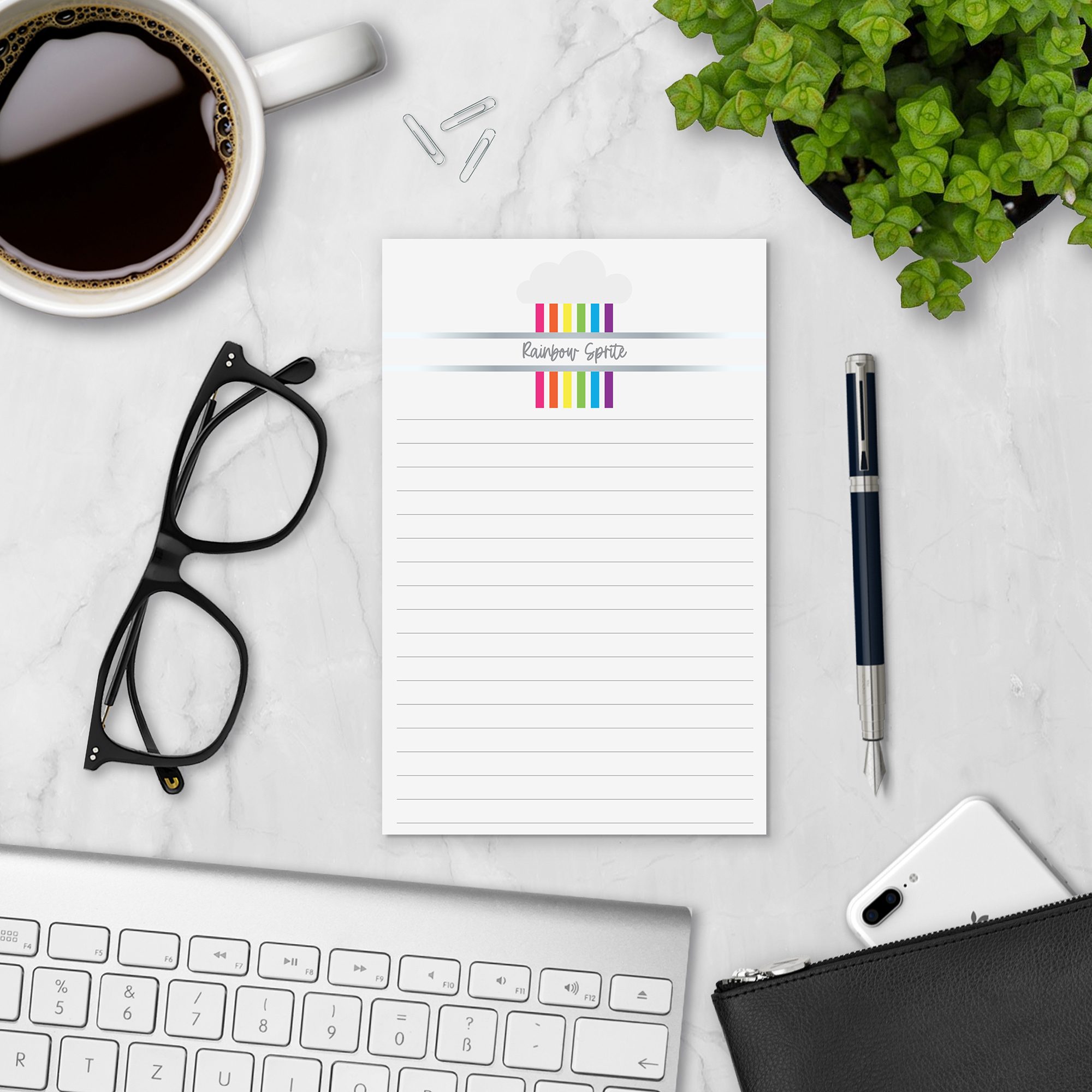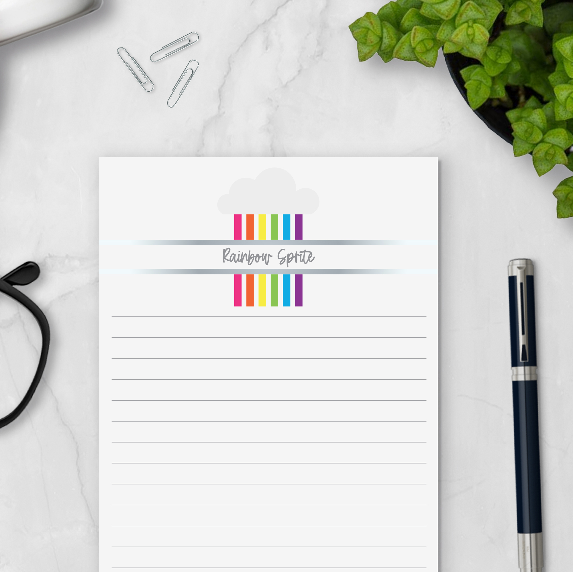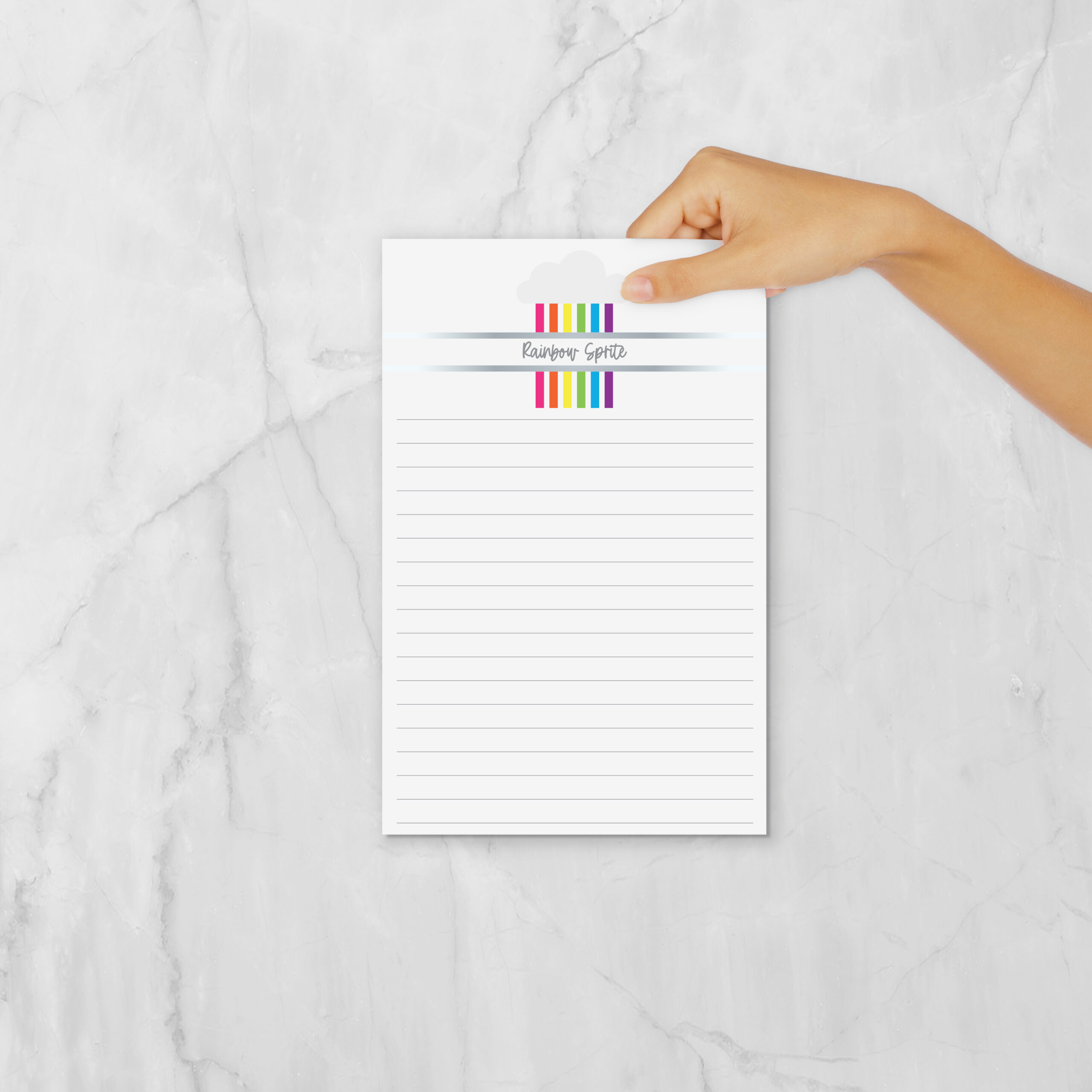 Brighten every page. This Personalized Notepad in our Rainbow Sprite design features a cheerful cloud and rainbow stripes customized with your name. Perfect for everyday lists, notes, and quick reminders. This notepad is printed on smooth, high-quality paper and designed for easy tear-off use. Whether you’re using it as desk stationery, a memo pad, or thoughtful personalized stationery, it adds a subtle, elevated touch to your workspace.