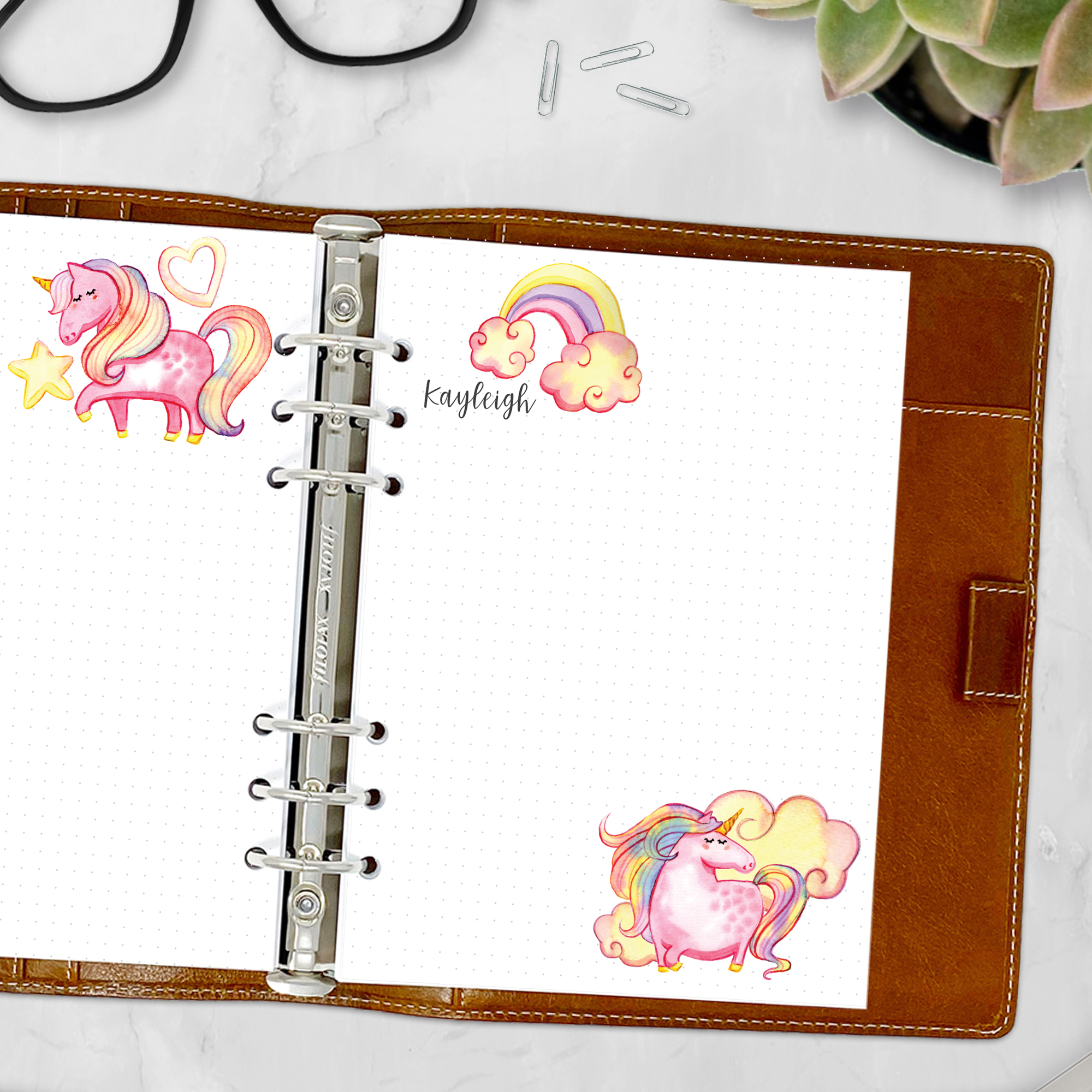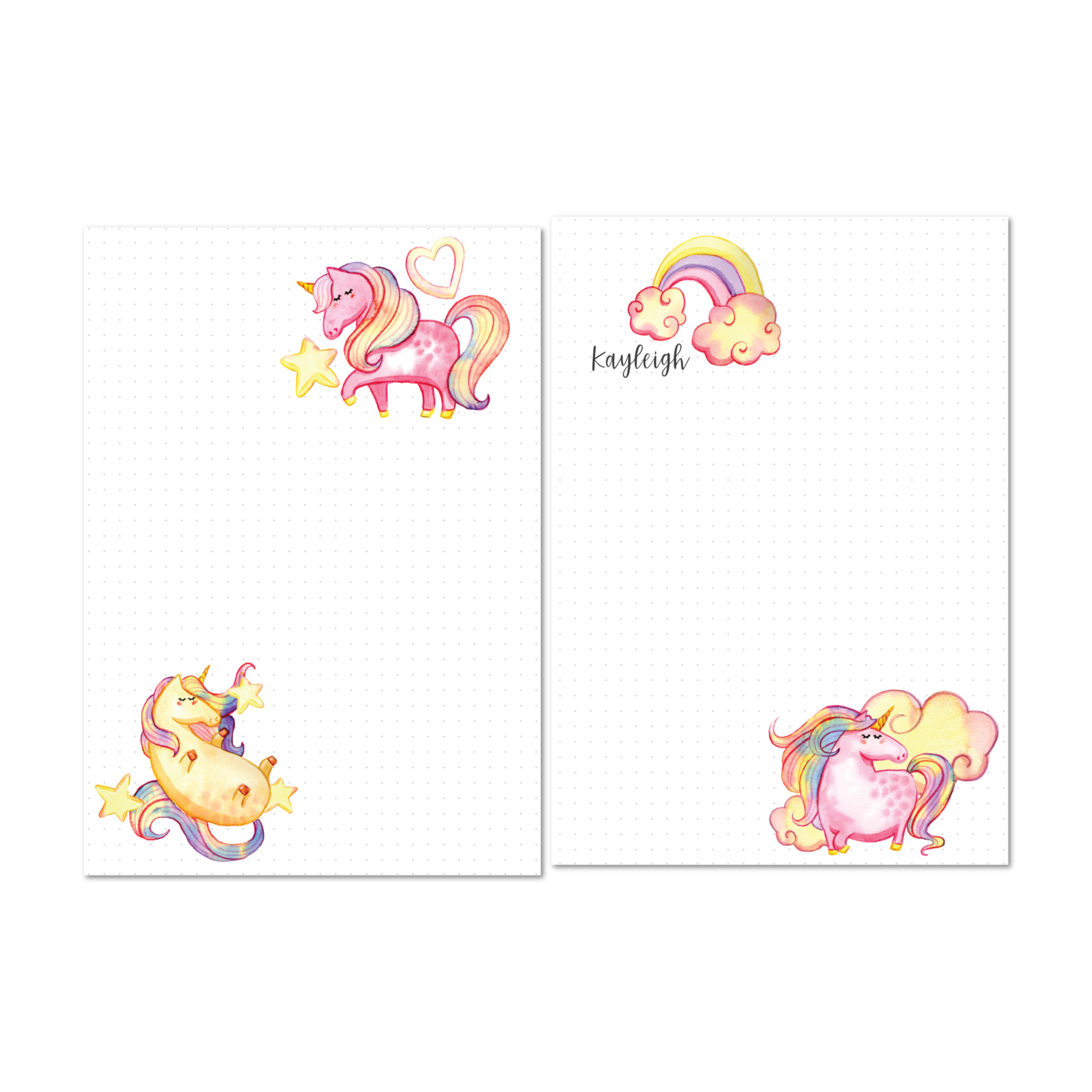 • Lined layout with a rainbow-themed illustrations and unicorns