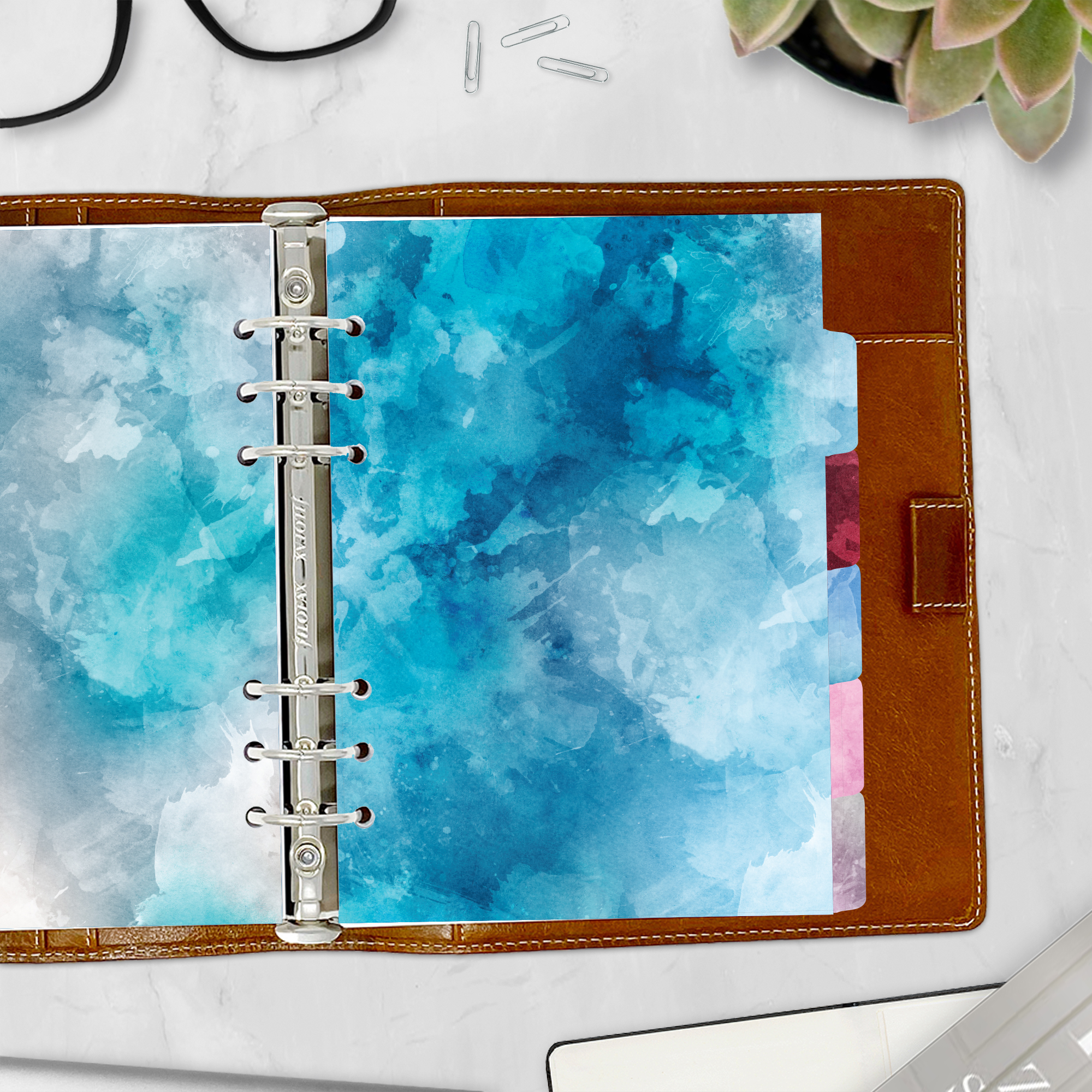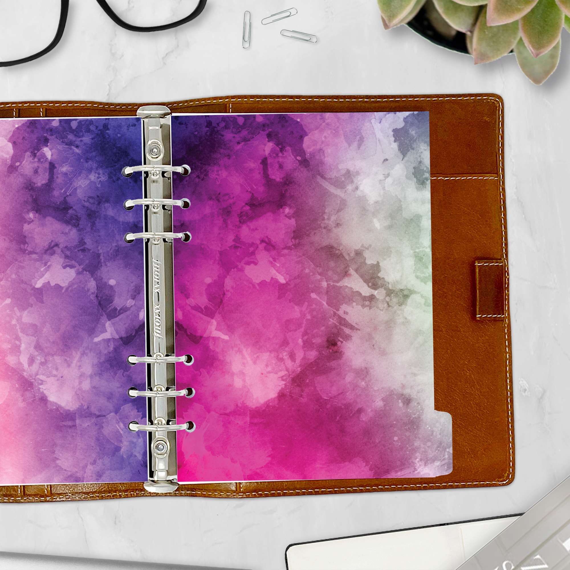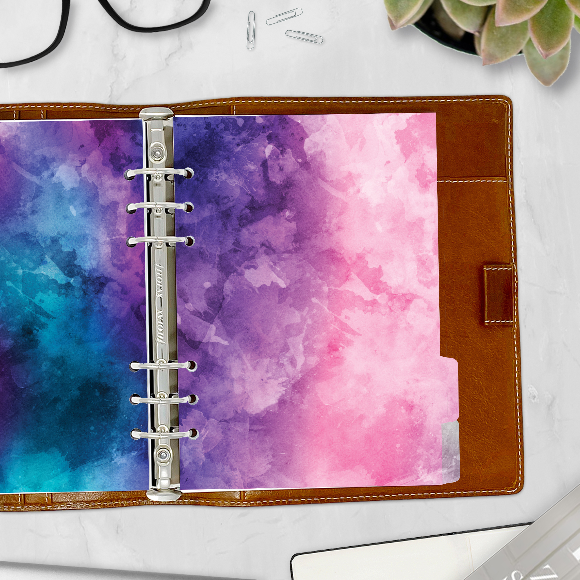 Brighten up your planner with our “Color Splash” tabbed dividers. Featuring a beautiful blend of cloudy, watercolor-like colors, these dividers add a vibrant and artistic touch to your organization. Perfect for those who love a burst of color and creativity in their planning. Crafted from high-quality 65 lb coated cardstock, they’re durable yet slim, ensuring they fit seamlessly even in the most petite-diameter rings without adding bulk.