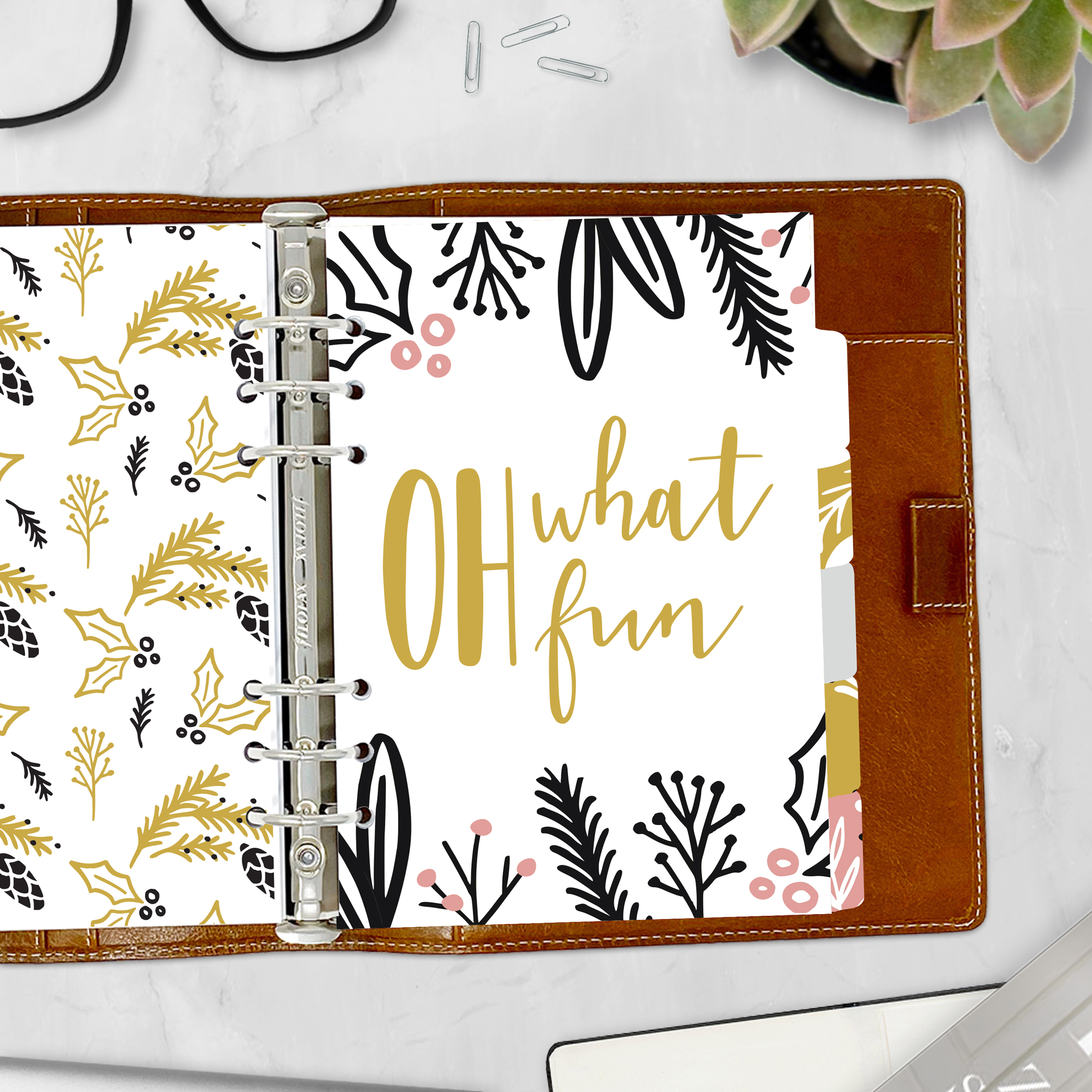 Celebrate the joy of the season with our “Oh What Fun” tabbed dividers. Featuring festive designs and cheerful holiday sayings, these dividers add a touch of merriment to your planner. Perfect for those who love to embrace the Christmas spirit with a playful and happy vibe. Crafted from high-quality 65 lb coated cardstock, they’re durable yet slim, ensuring they fit seamlessly even in the most petite-diameter rings without adding bulk.