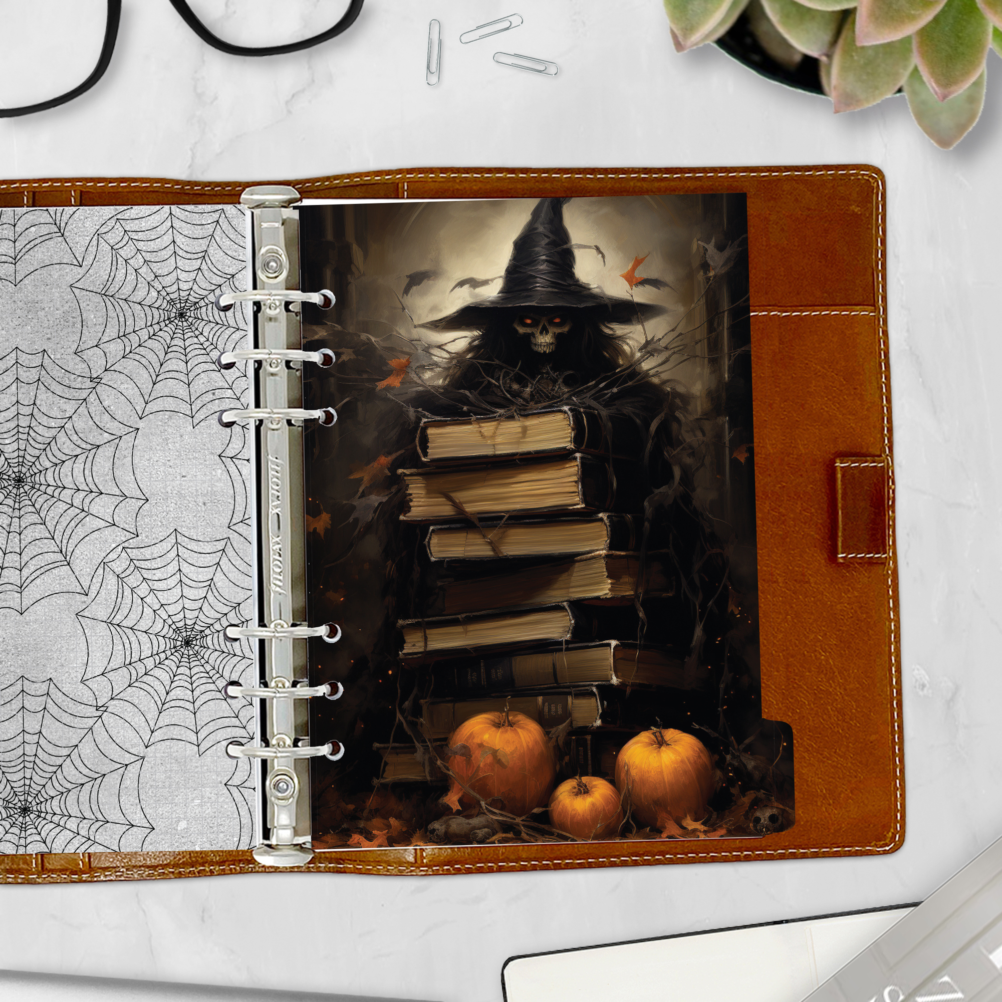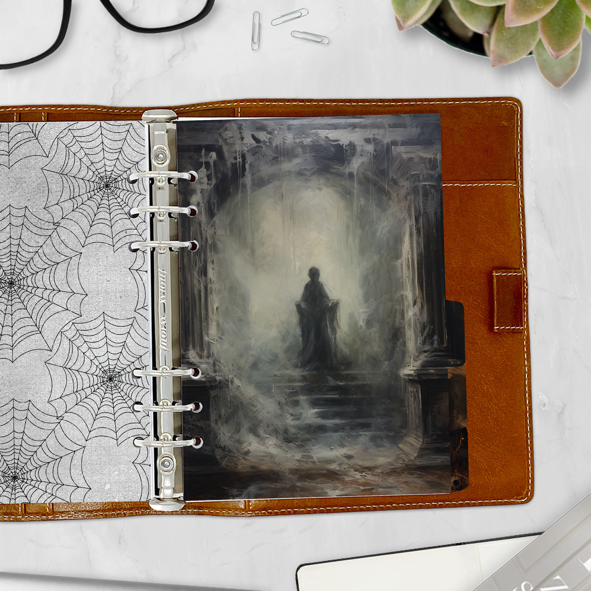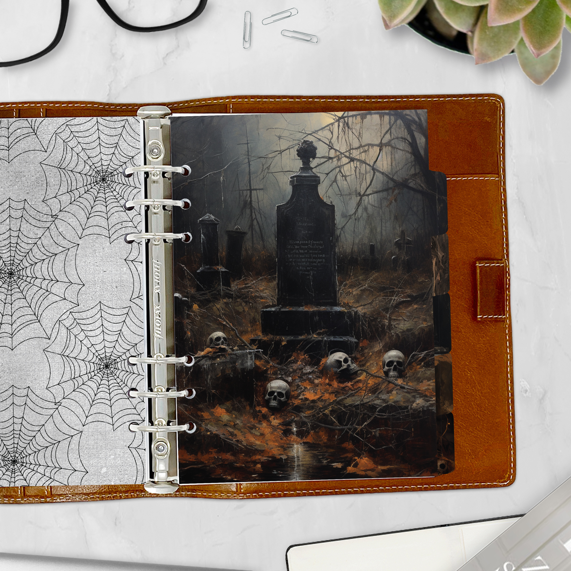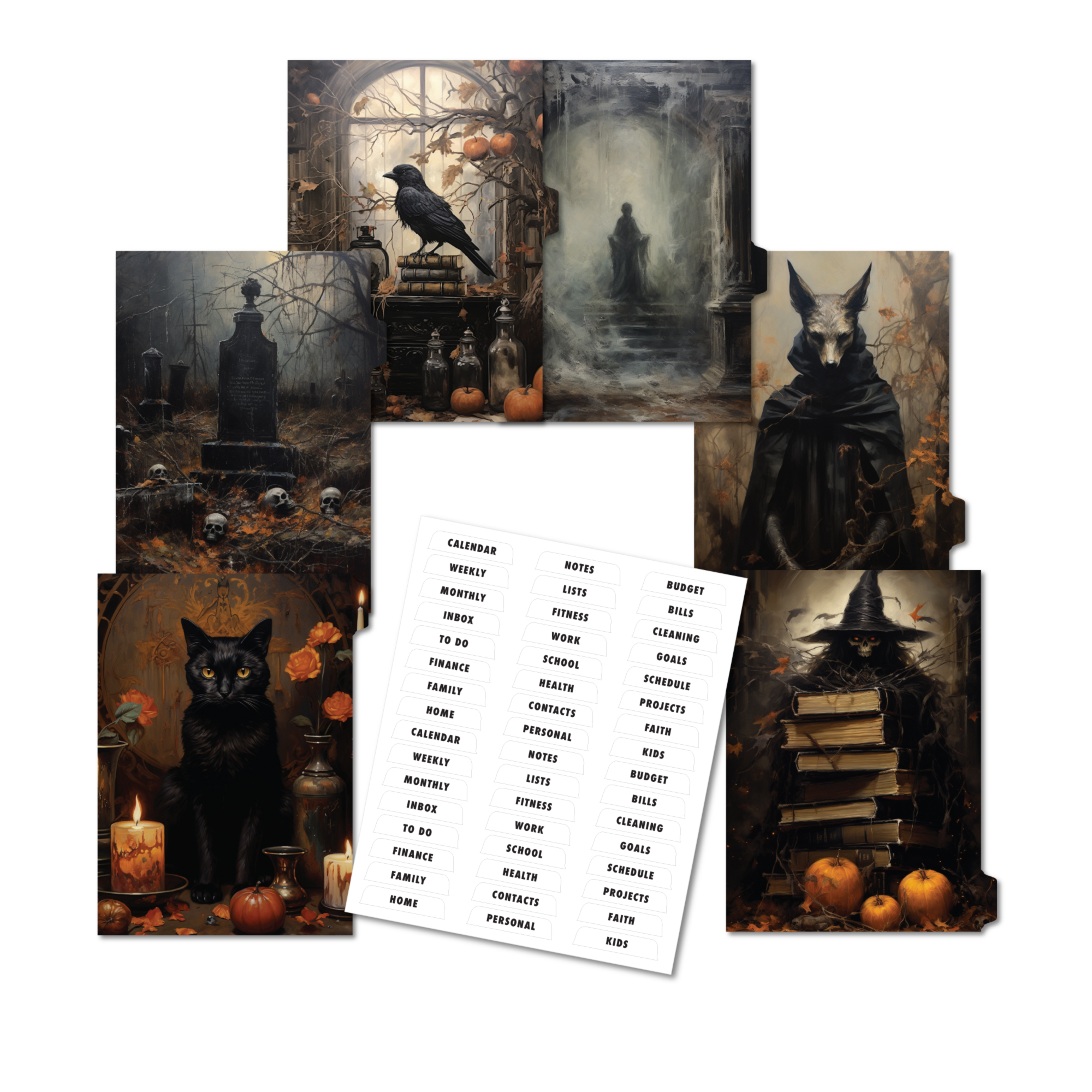 Celebrate the chills of October with our “Spooky Season” tabbed dividers. Featuring eerie designs like a black cat, a misty graveyard, a raven perched on a stack of books, a creepy hallway with a ghostly presence, and a mysterious wolf in the woods, these dividers bring a touch of haunting charm to your planner. Perfect for those who embrace the spookiness of the season. Crafted from high-quality 65 lb coated cardstock, they’re durable yet slim, ensuring they fit seamlessly even in the most petite-diameter rings without adding bulk.