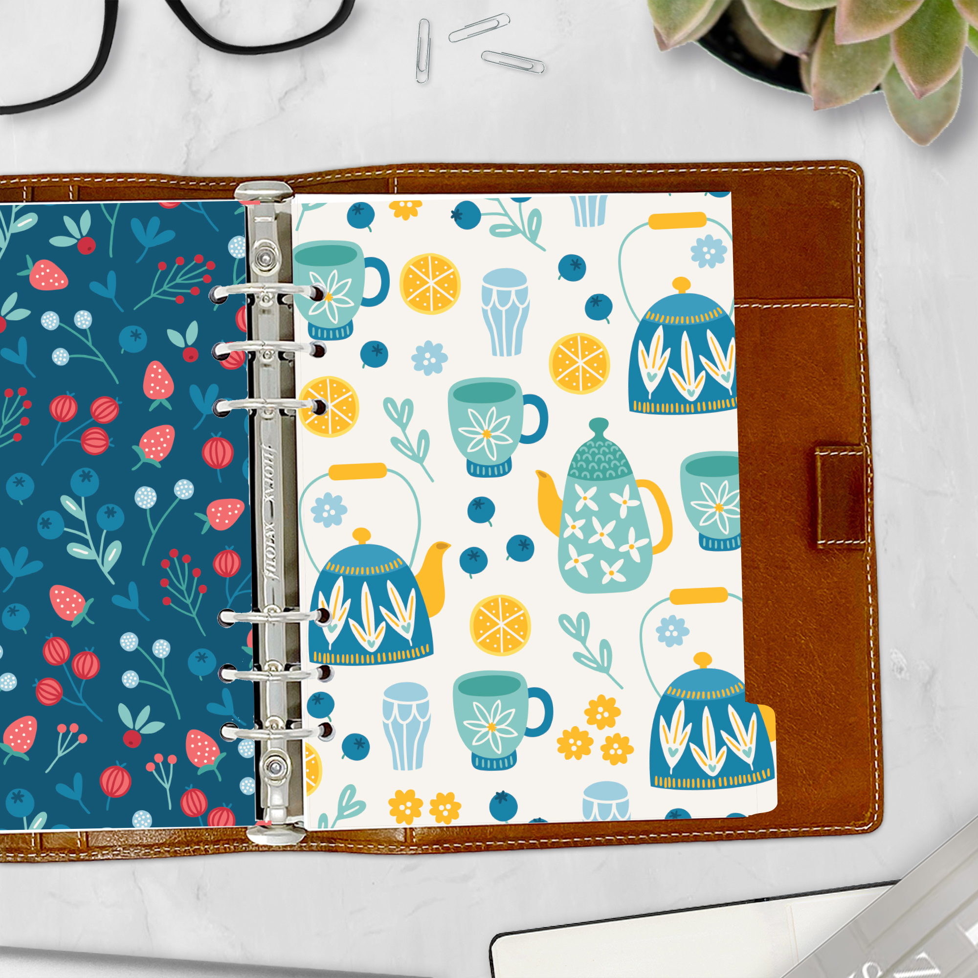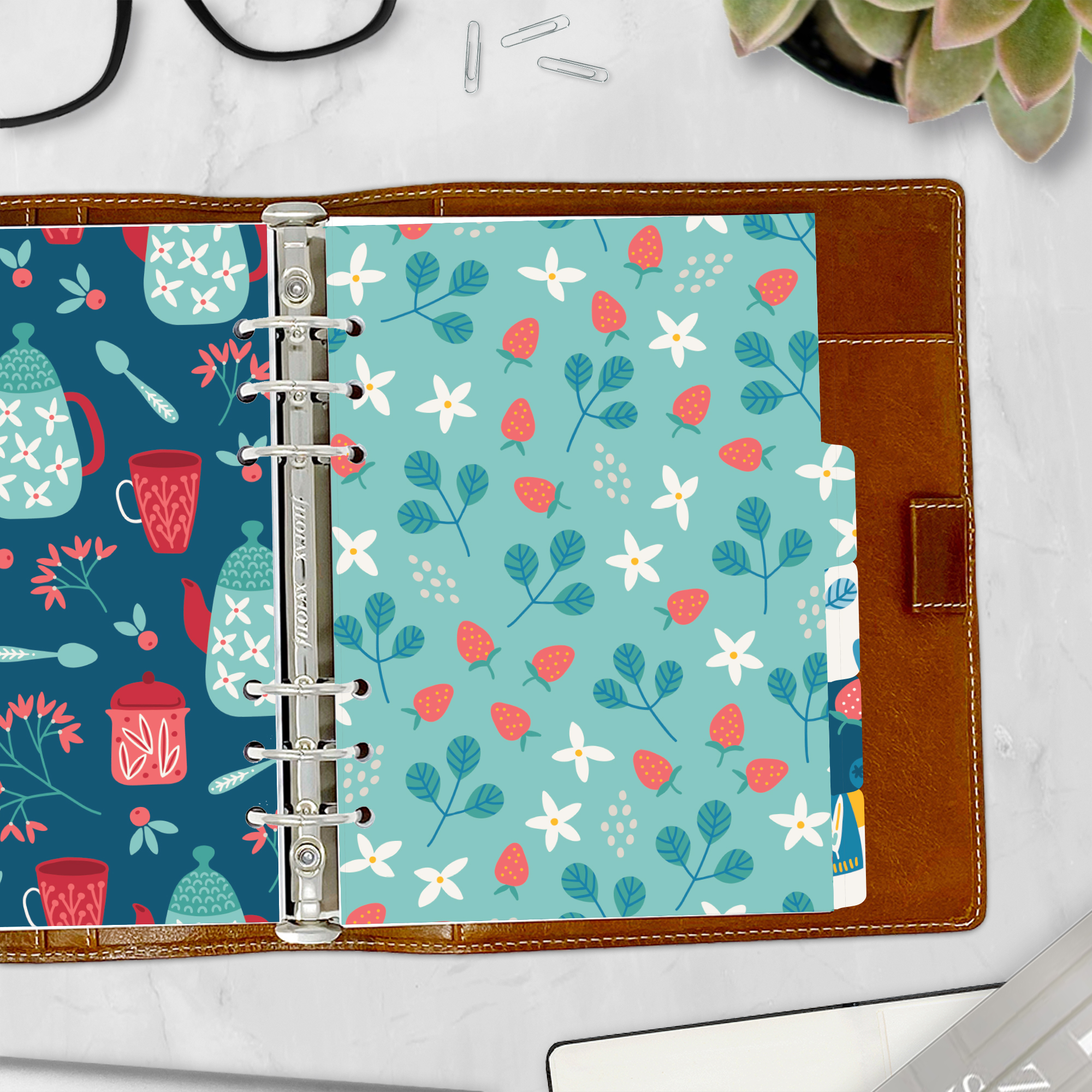 Indulge in a moment of calm with our “Tea Time” tabbed dividers. Featuring charming designs of tea cups, honey jars, jam, and delicate florals, these dividers bring a cozy, inviting feel to your planner. Perfect for those who appreciate the simple joys of a warm cup of tea. Crafted from high-quality 65 lb coated cardstock, they’re durable yet slim, ensuring they fit seamlessly even in the most petite-diameter rings without adding bulk.
