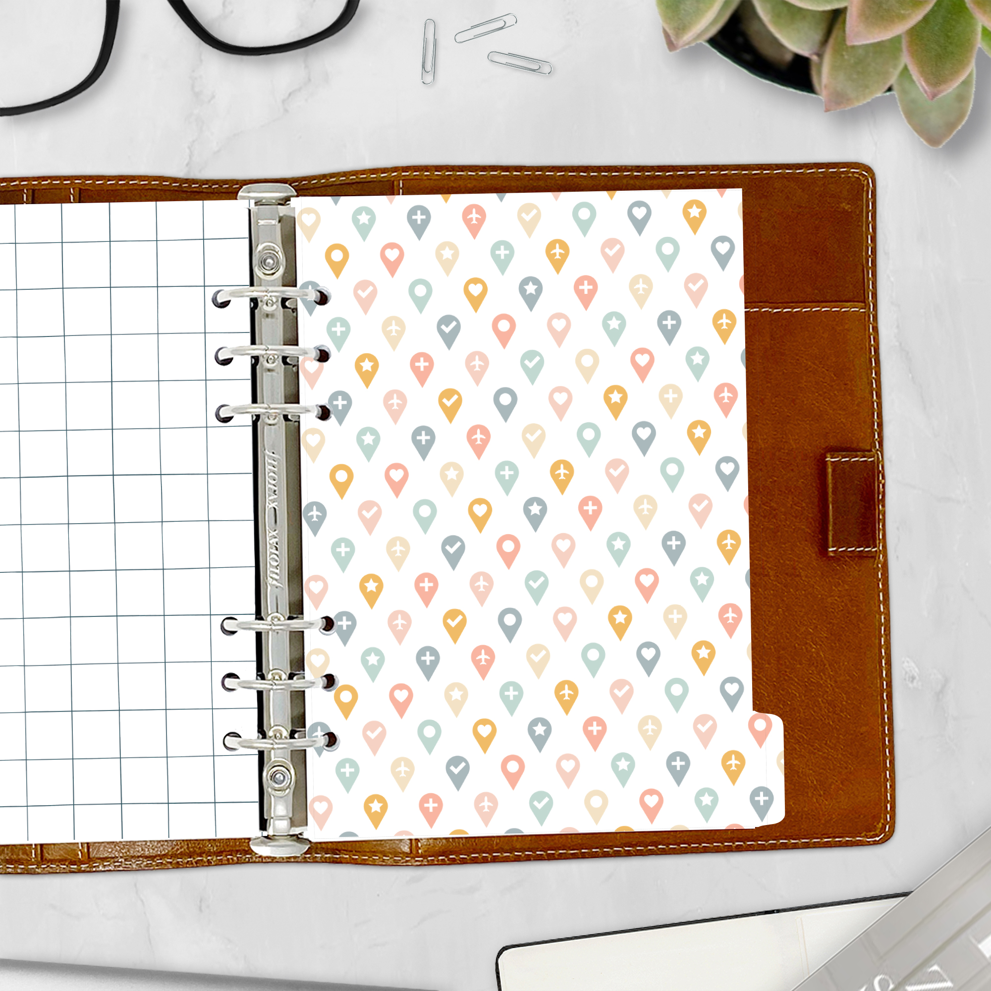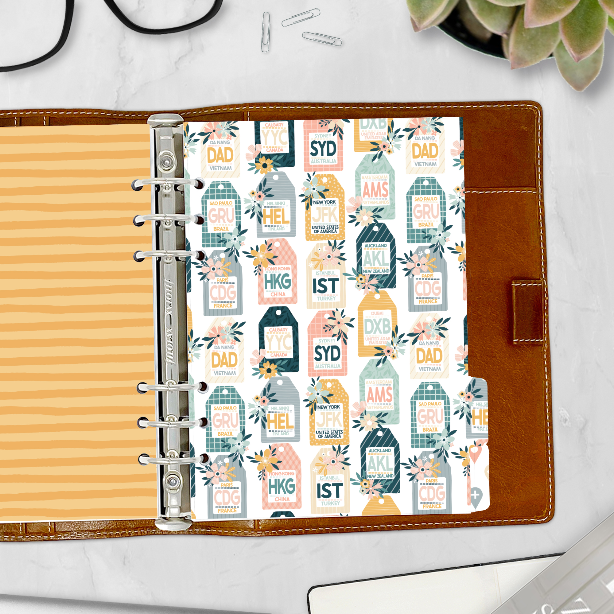 Embrace your love for travel with our “Wanderlust” tabbed dividers. Featuring light, airy colors and designs of globes, suitcases, and airport tags, these dividers inspire adventure and exploration. Perfect for those who dream of new destinations and journeys. Crafted from high-quality 65 lb coated cardstock, they’re durable yet slim, ensuring they fit seamlessly even in the most petite-diameter rings without adding bulk.