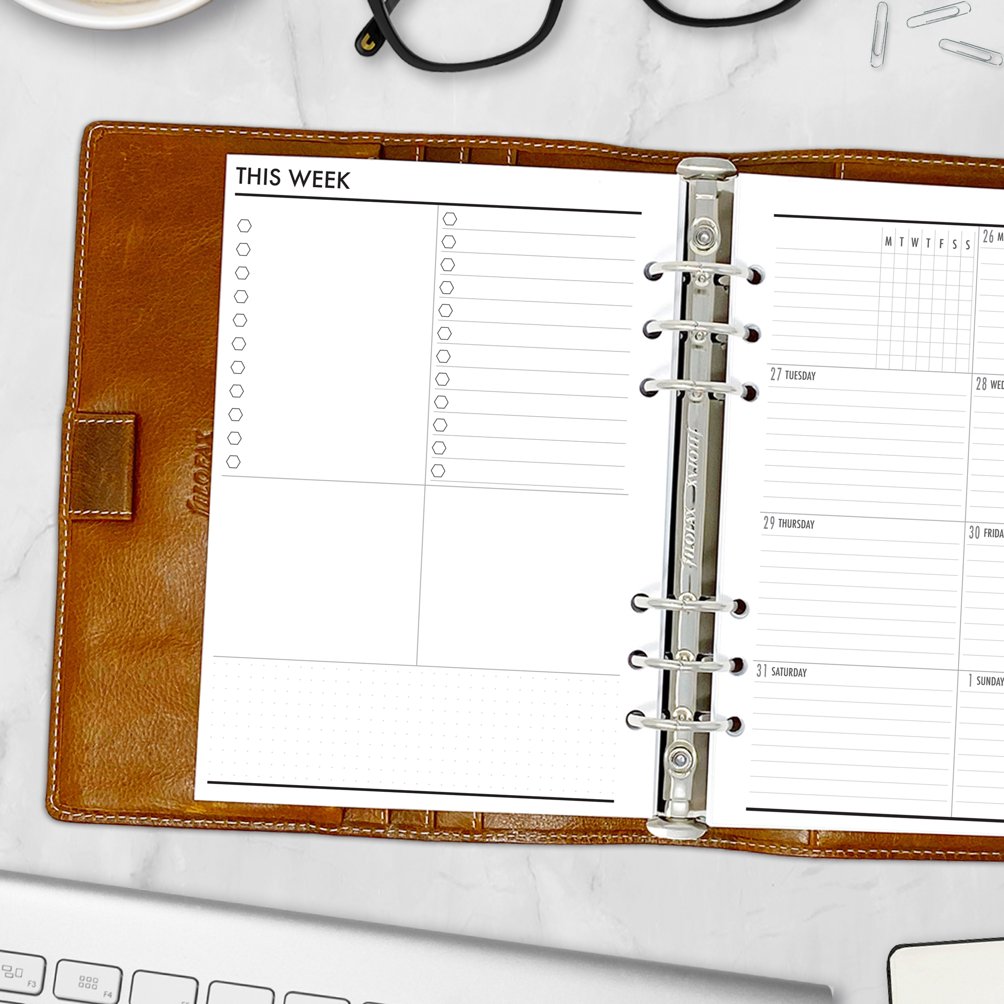 - CALENDAR LAYOUT – Choose from Deluxe or Compact. The Deluxe features our “This Month” dashboard before the week with the first day of a month, where you can record your approach for the period. On the backside, after approximately four weeks (sometimes five, depending on where the first lands), you have a Notes page to write the information you need to keep handy. It is great if you like to separate each period with dividers. If you prefer your calendar slimmer or have smaller diameter rings, go with the Compact version. The Compact takes out the dashboard and notes pages, so the weeks are printed back to back. See pictures and video for the deluxe example layout.