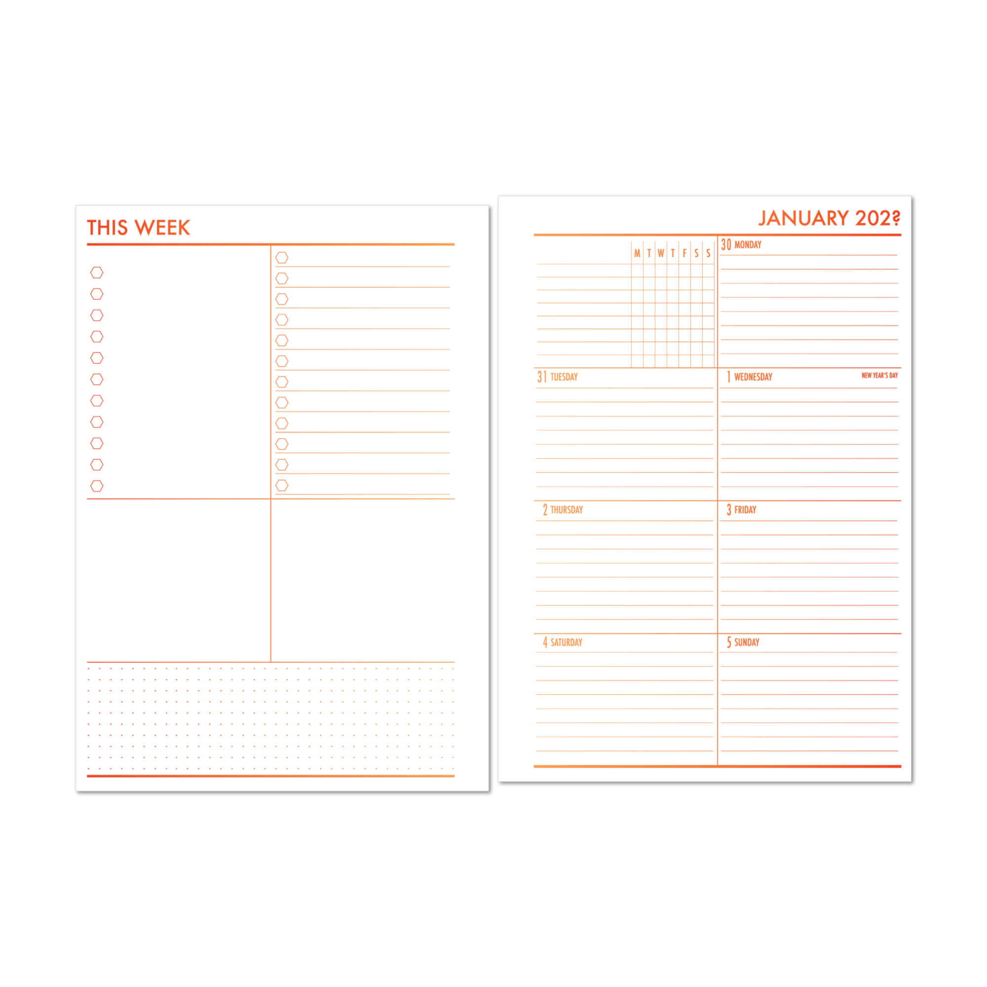 - Compact: Monthly spreads printed back to back with no dashboard or notes pages