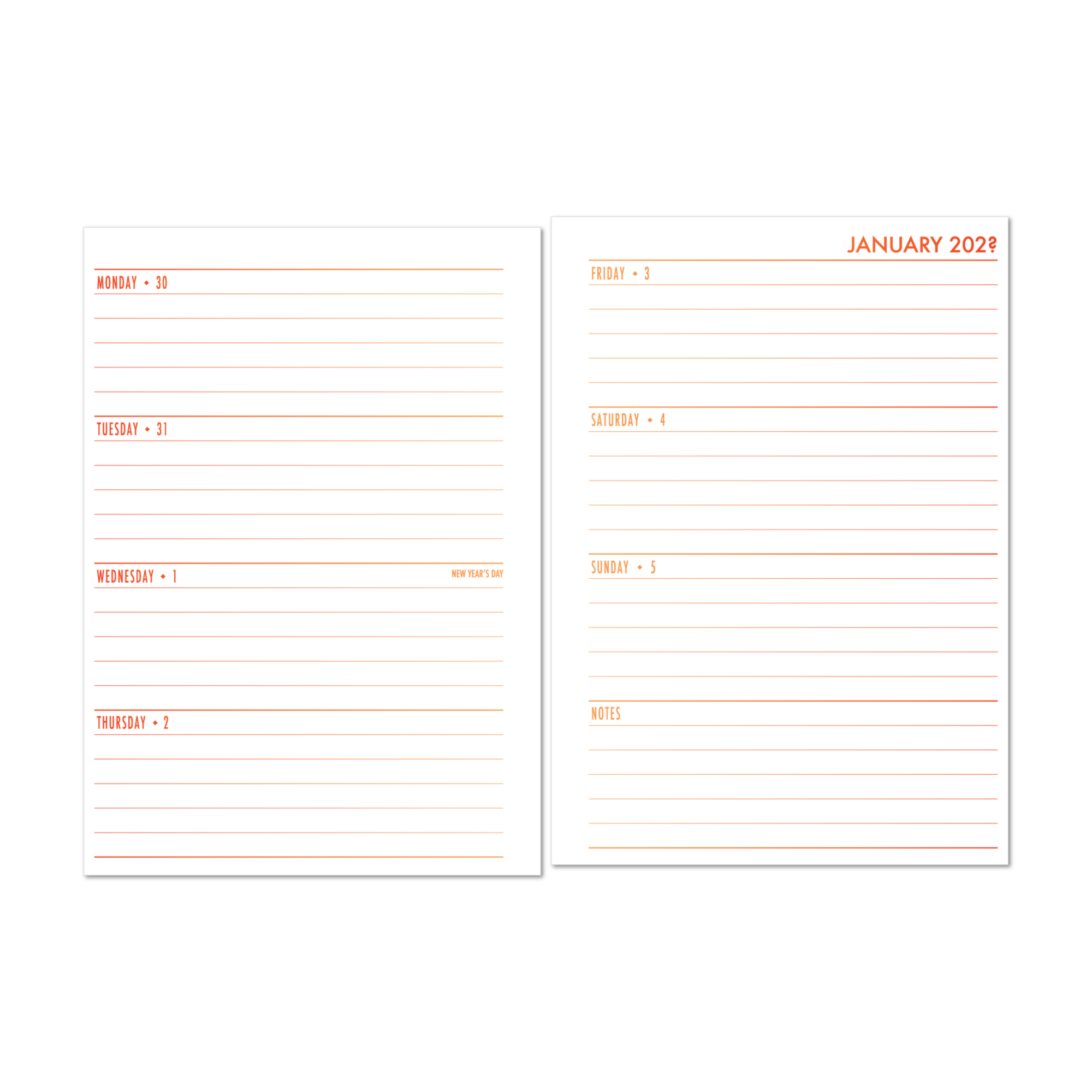 • Compact: Monthly spreads printed back to back with no dashboard or notes pages