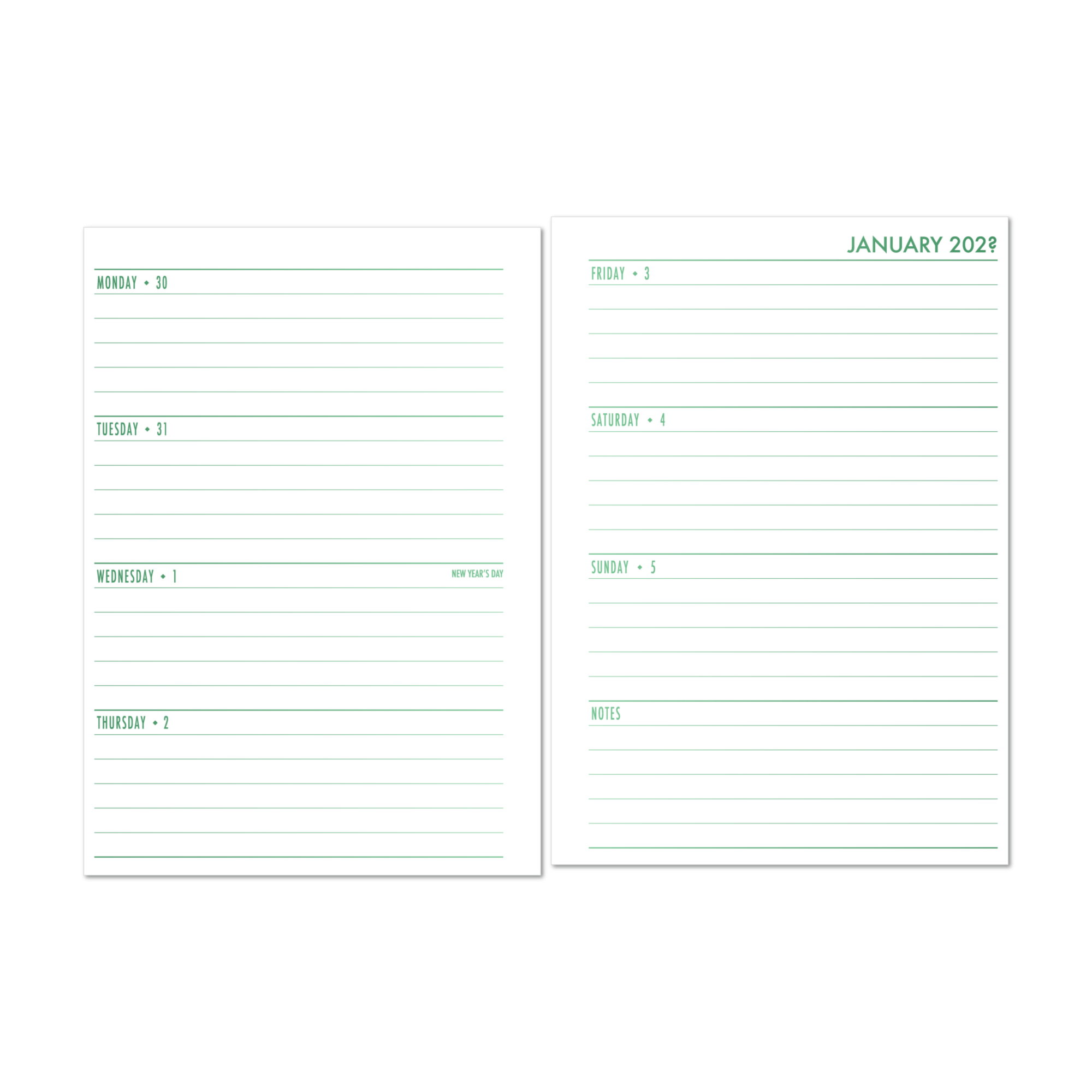 - Compact: Monthly spreads printed back to back with no dashboard or notes pages