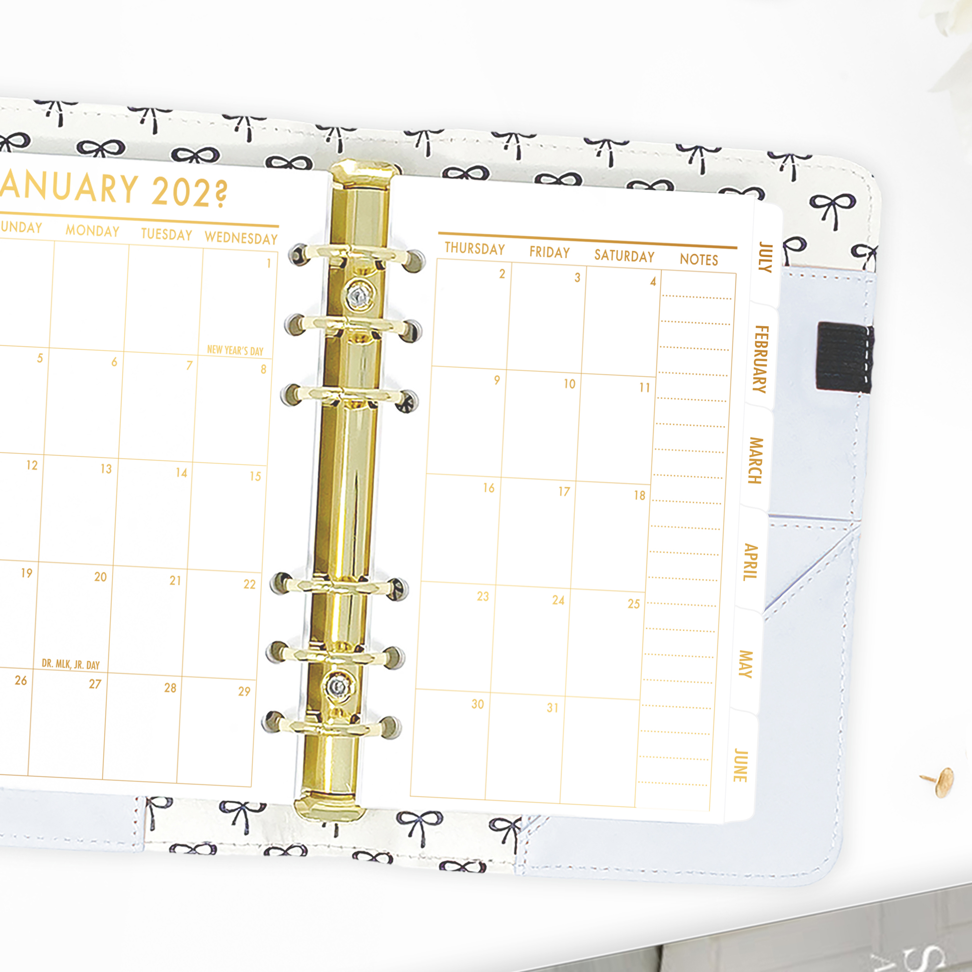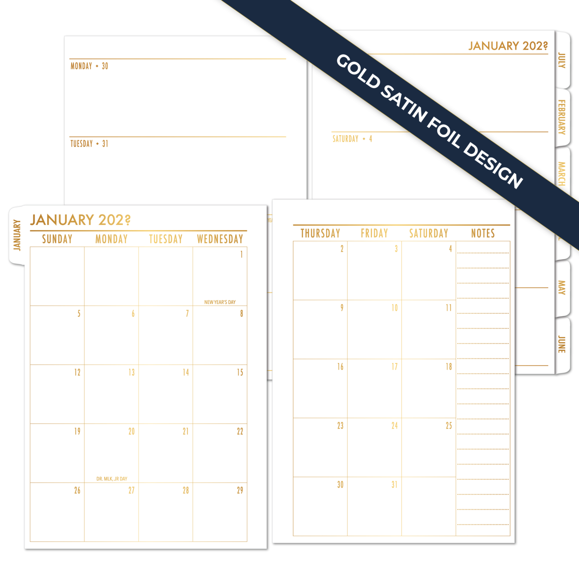 The CityGirl Planners Gold Satin Foil weekly horizontal + monthly tabbed planner insert (complete layout) is a fully foiled calendar refill with built-in tab dividers and both your monthly and weekly spreads in one insert — every page, front and back, cover to cover. The gold satin finish has a soft, brushed-gold warmth that catches light without being flashy. No black toner, no unfoiled pages. The tabs are built into the This Month dashboard, so this insert comes in Deluxe layout only. Every spread you turn to has that warm gold sheen on premium bright white paper. Clean layouts, easy-to-find months, and the kind of quality that belongs inside a luxury agenda. Choose your size from the drop-down and start planning.