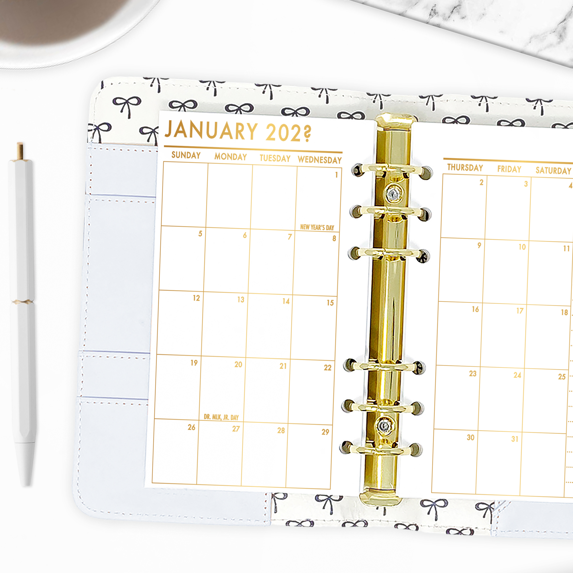 The CityGirl Planners Gold Satin Foil week on 1 page + monthly planner insert (complete layout) is a fully foiled calendar refill with both your monthly and weekly spreads in one insert — every page, front and back, cover to cover. The gold satin finish has a soft, brushed-gold warmth that catches light without being flashy. No black toner, no unfoiled pages. Every spread you turn to has that warm gold sheen on premium 80# text weight paper. Clean layouts, thoughtful spacing, and the kind of quality that belongs inside a luxury agenda. Choose Deluxe or Compact layout, pick your size from the drop-down, and start planning.