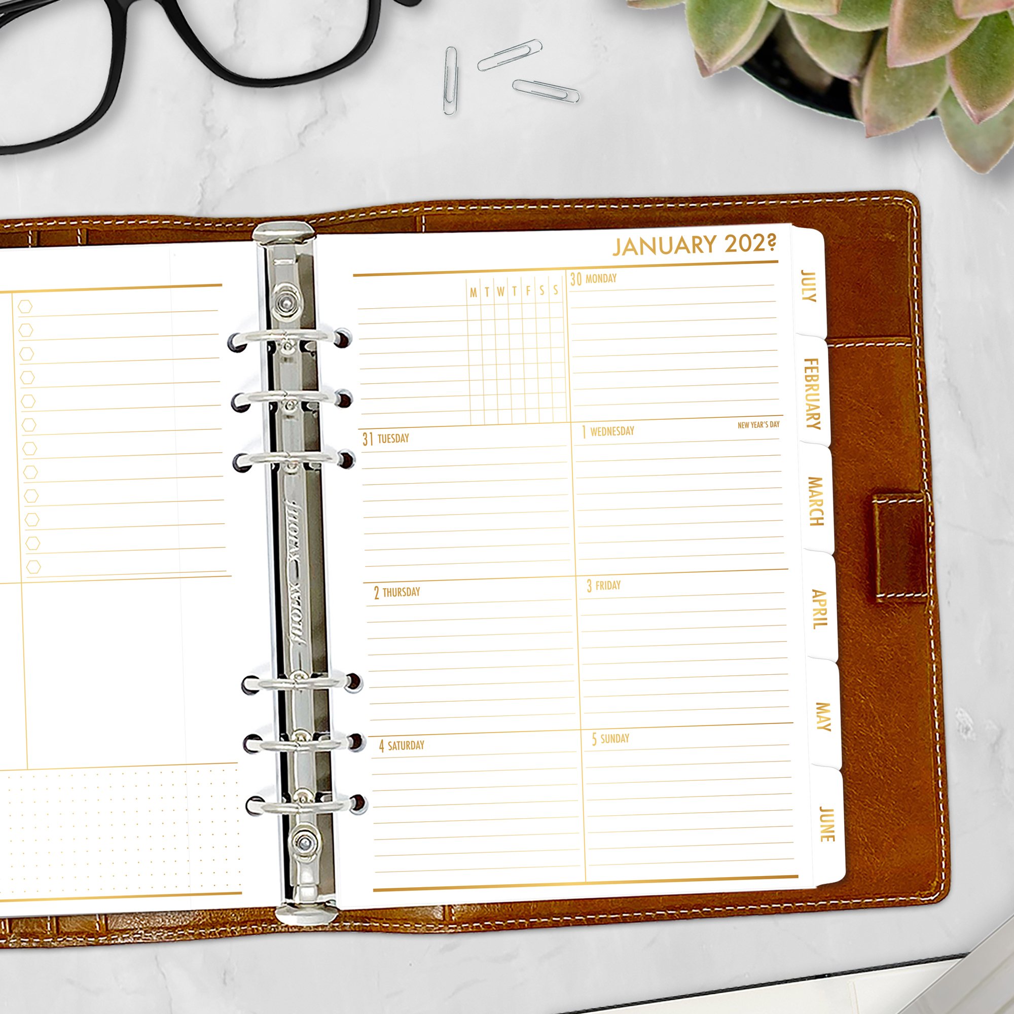 Weekly One Page + Monthly Tabbed Planner Insert – Gold Satin Foil | Text Tabs (Complete Layout)